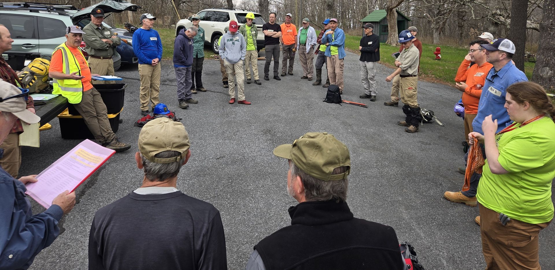 Great weather led to the largest turnout in recent memory for the Hoodlums’ second outing of the season. Nearly 40 Hoodlums met at the site of the old Piney River CCC camp in the North District of SNP to meet their fellow maintainers, divide into crews, hear their assignments for the day, and get tools. Head Hoodlum Tom Troutman led the proceedings, including a round of introductions and the all-important safety briefing. The crews then headed off to tackle their assignments.