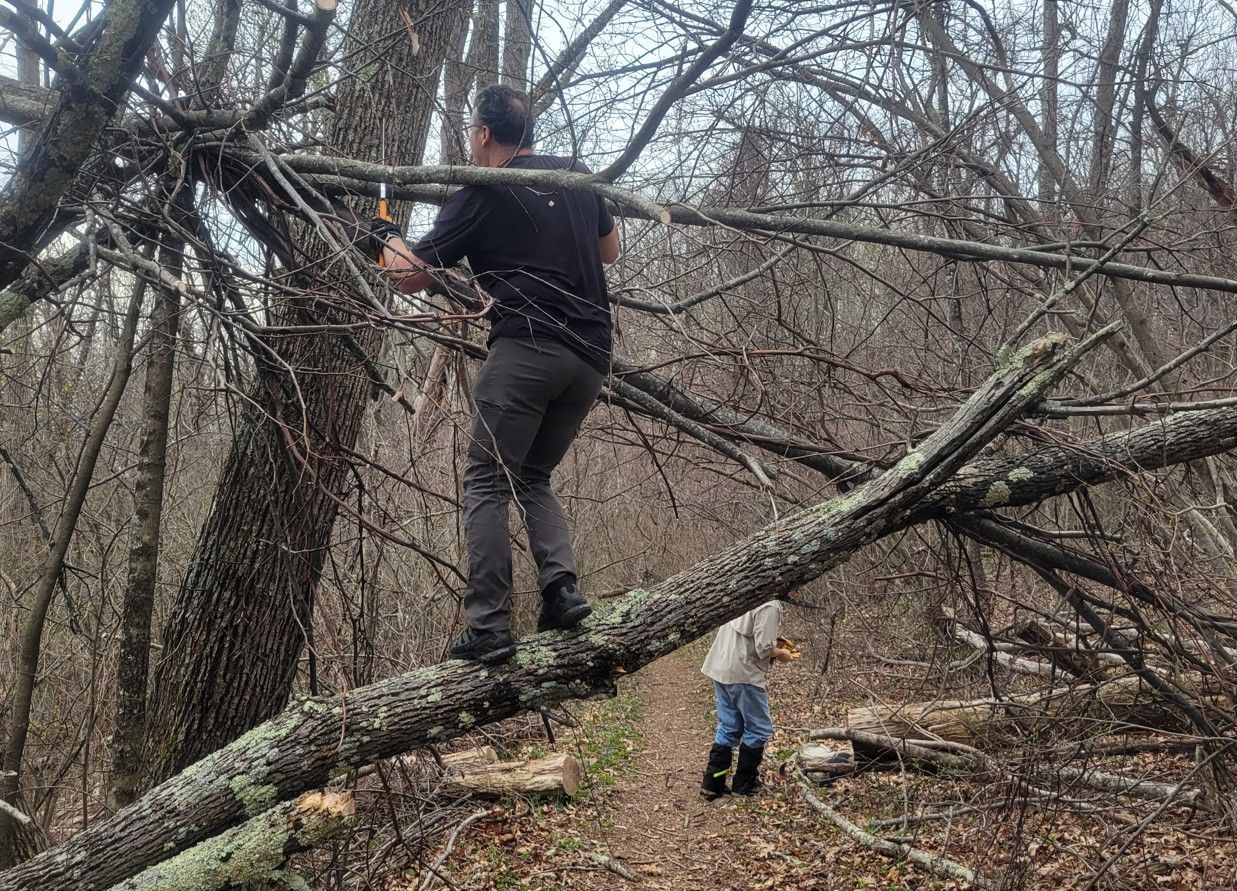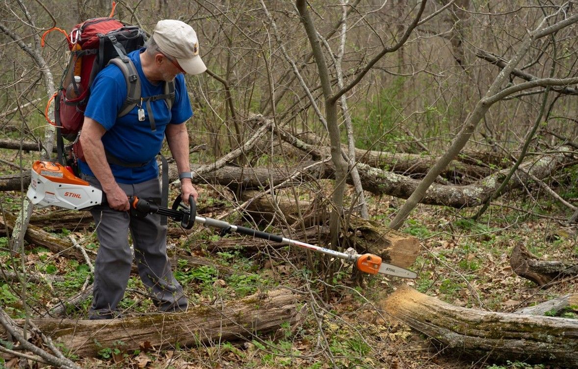 Head Hoodlum Tom Troutman led a crew up the Pass Mountain Fire Road to the Pass Mountain Shelter. The crew, Erin Taylor, Kevin Cwalina, and new Hoodlum Brian Blackman, cleared multiple blowdowns on the Pass Mountain trail, the AT to Pass Mountain Shelter Trail, and the AT. They used a combination of chainsaw (sawyer Tom Troutman) and pole saw. Each crew member got an opportunity to use the battery powered pole saw.