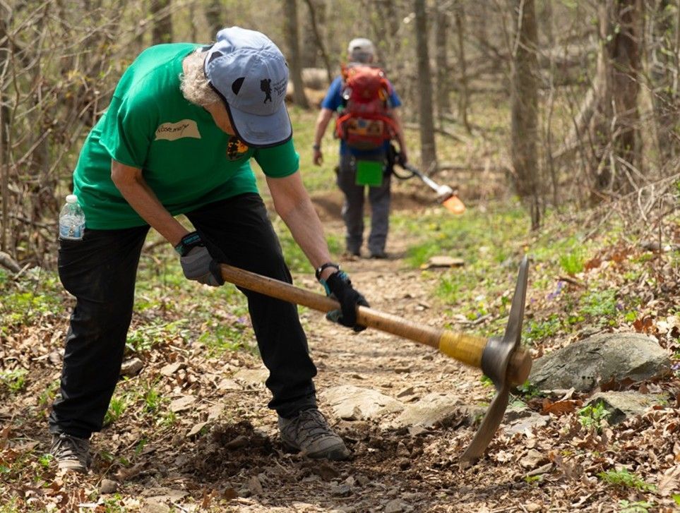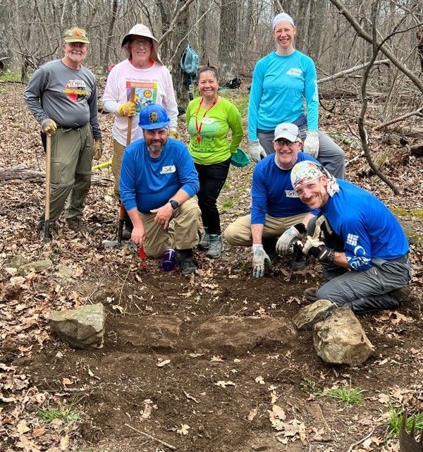 Dave Nebhut led a crew of veteran and first-time Hoodlums to rehabilitate trail structures on the AT north of Mount Marshall. The crew replaced 12 failing check dams and constructed three rock check dams. Dave’s crew included Cindy Ardecki, Chris and Michelle Viggiano, Greg Pearson, Jeff Prater, Michael Durland, and Kim Chau, Justin Corddry and Tom Moran co-led a team of eight on a crosscut expedition down Piney Branch Trail all the way to the park boundary, where they had staged vehicles for the return trip back up to the Piney River CCC camp where the day started. This hike totaled around seven miles and included multiple stream crossings. They fully cleared the upper section, cleared most of the middle section but, after 35 blowdowns, finally had to stop work and hike out as time ran out on the day. More downed trees were left for another day.