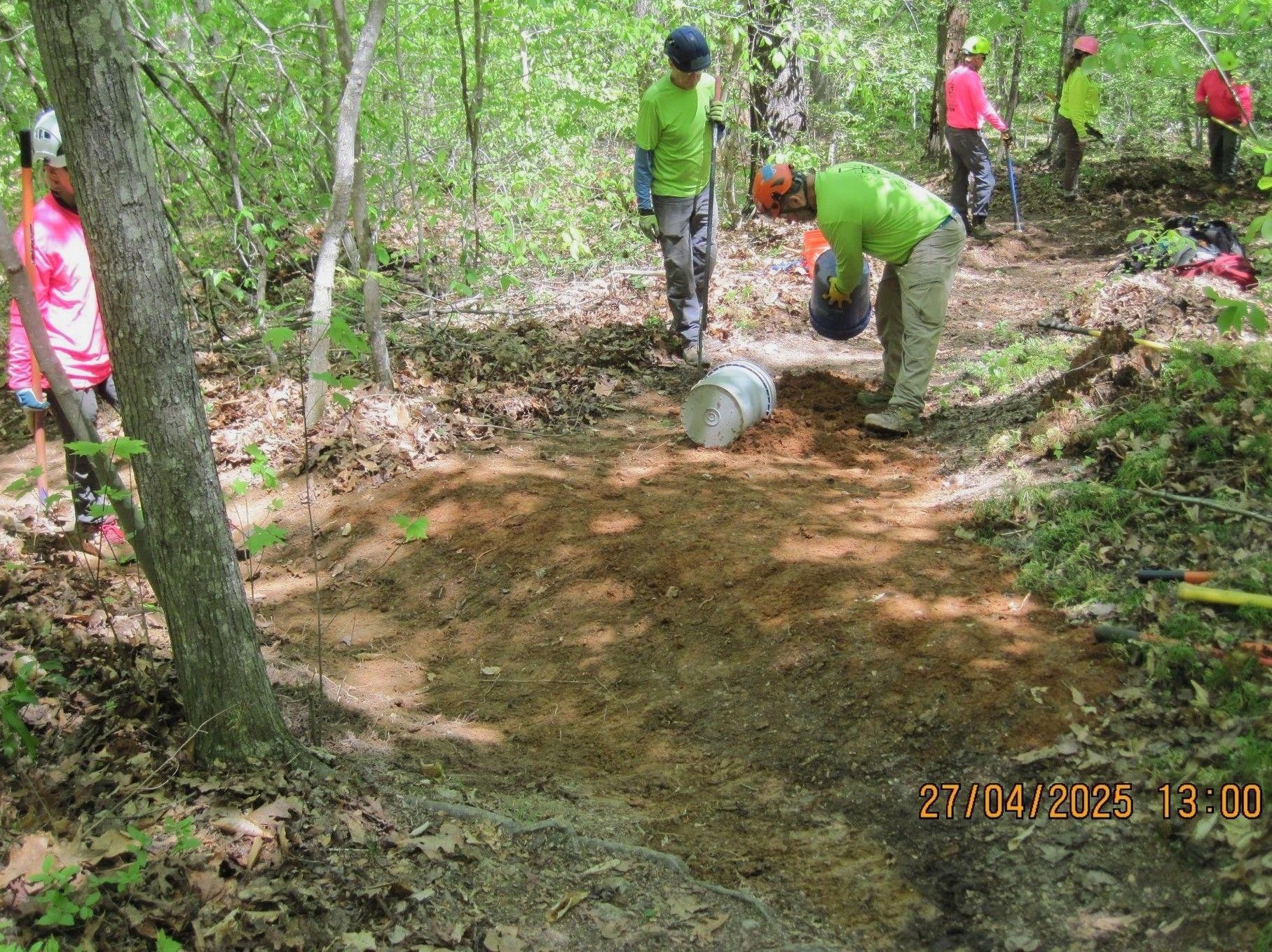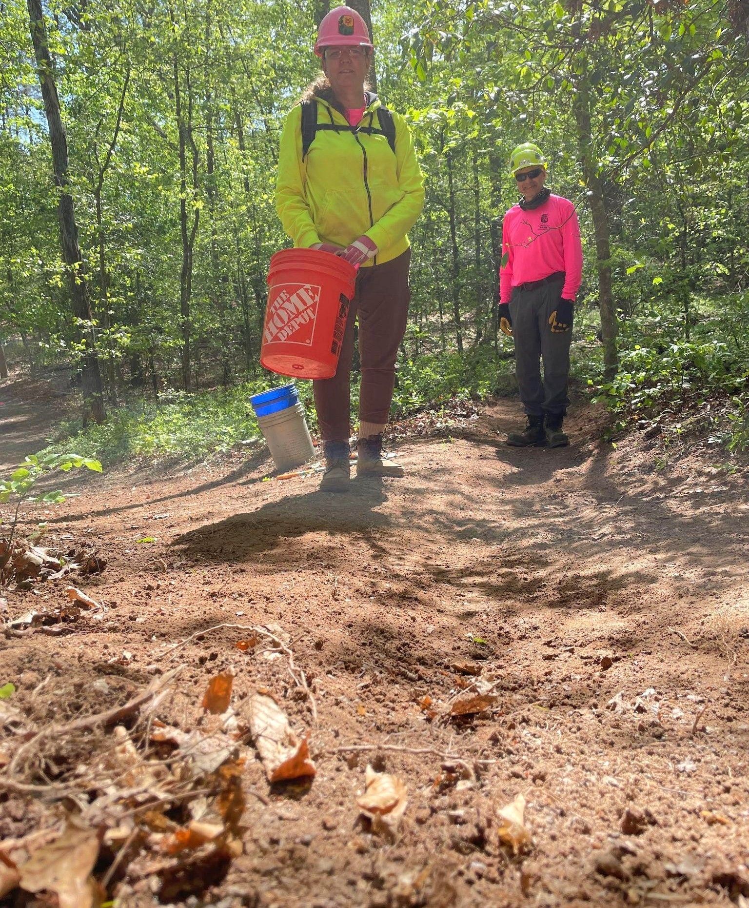Steve Phillips, Tysha Robinson, and Ellen Shaw were working on the same waterbar or moving tools back to the trailhead for cleaning.