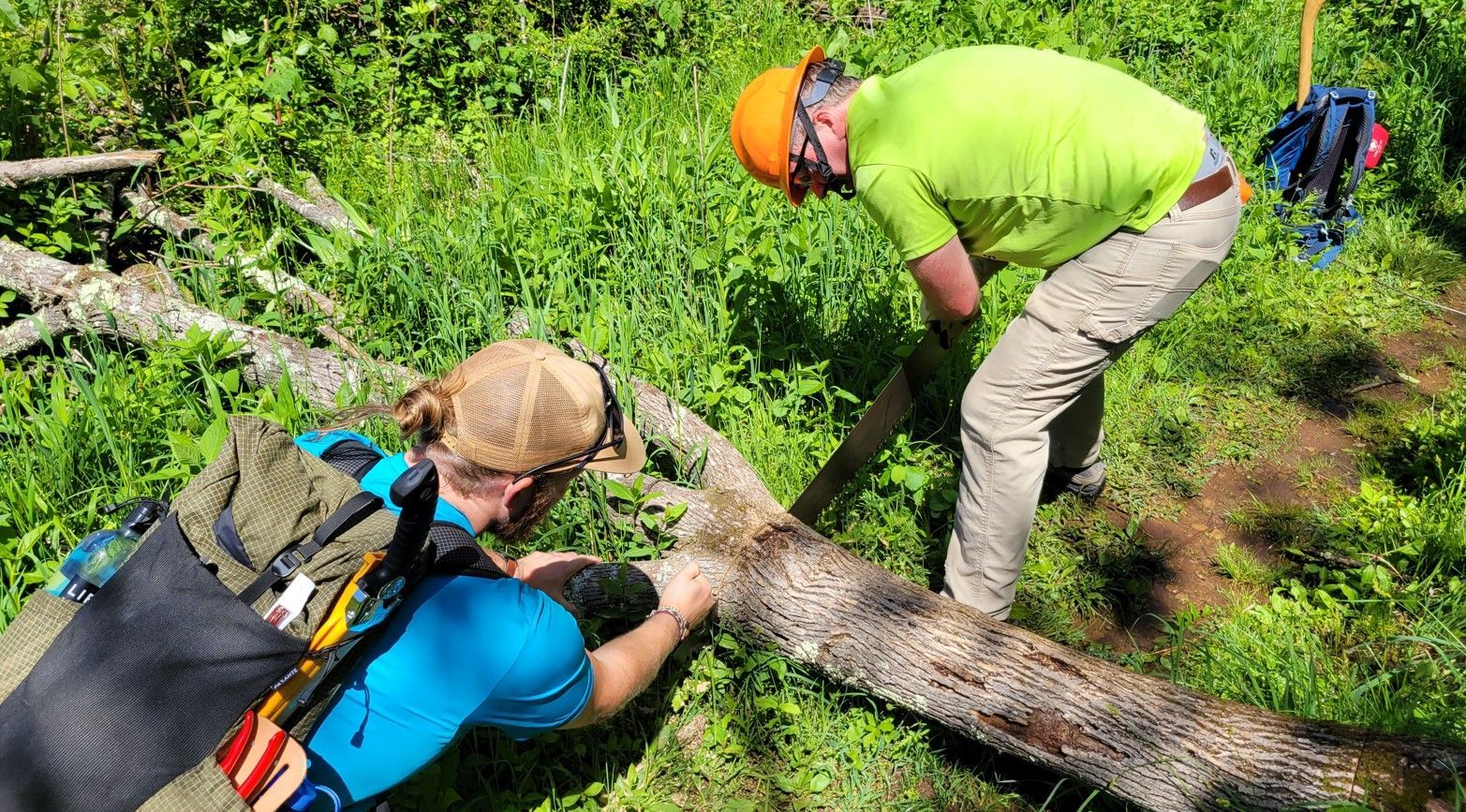 After lunch a special situation awaited them – a multi-trunk blowdown fully engulfed in a poison ivy crown that had come down with the trees. One trunk of the ivy was over 4” in diameter, and the leafy fines smothered the trail and trunks such that you couldn’t see through the mass. The trail was completely blocked, the inevitable social trail had evolved but the blockage was unacceptable.