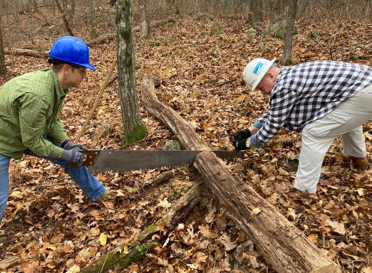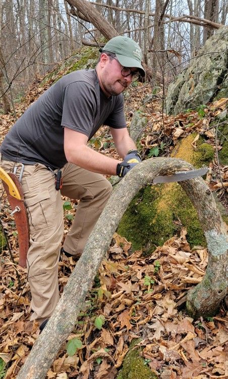 A crew including Connor Moynihan, Jamie Benson, Kyle Brost, and leader Tom Moran parked at Beahms Gap and hiked south, up and over Pass Mountain on the A.T. A scouting trip the previous weekend indicated eight blowdowns on the section, which the crew cleared as well as additional loose limb and trunk chunks. The crew carried a vintage Jemco 42” saw checked out from the PATC HQ tool cache, freshly sharpened and ready to cut. At each blowdown they walked through the OHBEC framework to analyze and execute each cut. This framework for bucking downed trees is substantially the same for chainsaw versus crosscut sawyers. All crew members were encouraged to voice their opinions on each step as the crew addressed each blowdown. At a high level the OHBEC framework steps are: