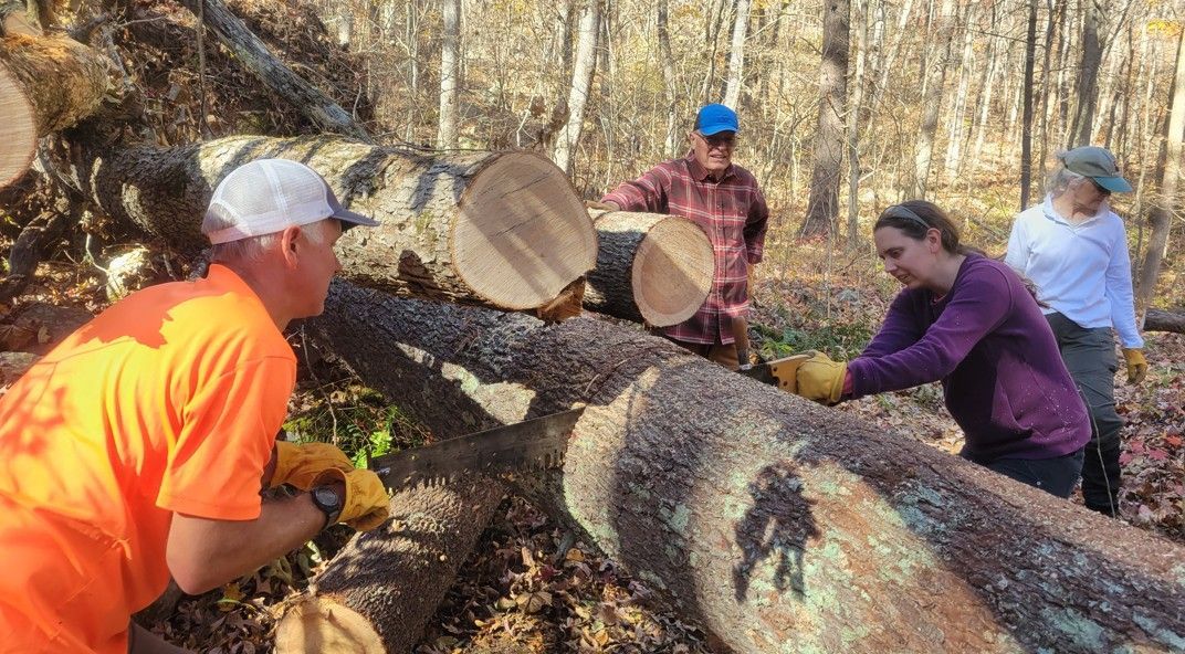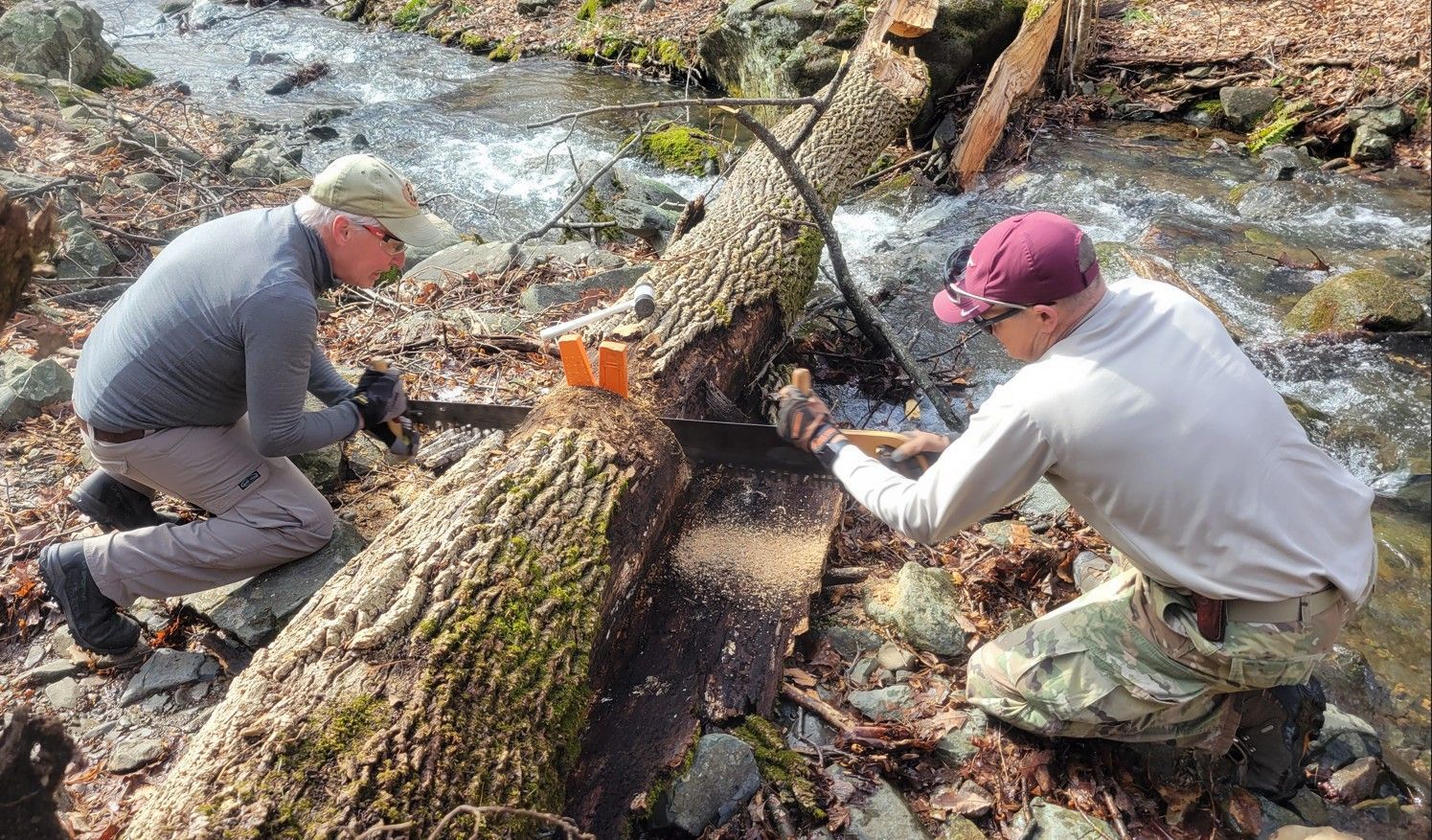 While Shenandoah doesn’t require crosscut certification for use in the park, safety is still critically important, and the crew doesn’t rush into cutting before conducting a full assessment of the area, potential safety hazards, and expected impact of gravity and bind on a given cut. While SNP doesn’t require certification, other public lands do, such as National Forest administered properties through which the AT passes in southwest Virginia and North Carolina. Hurricane Helene did significant damage to hiking trails in those areas and, while volunteers are needed to help re-open the trails, the lack of crosscut certification is an impediment. Five of the Eager Beavers – Justin Corddry, Joe Phillips, Bruno Carlot, Dan Hippe and Tom Moran have enrolled in crosscut certification classes administered by the Appalachian Trail Conference, with the goal not just to improve their skill levels but also to open up the opportunity to volunteer outside of SNP.