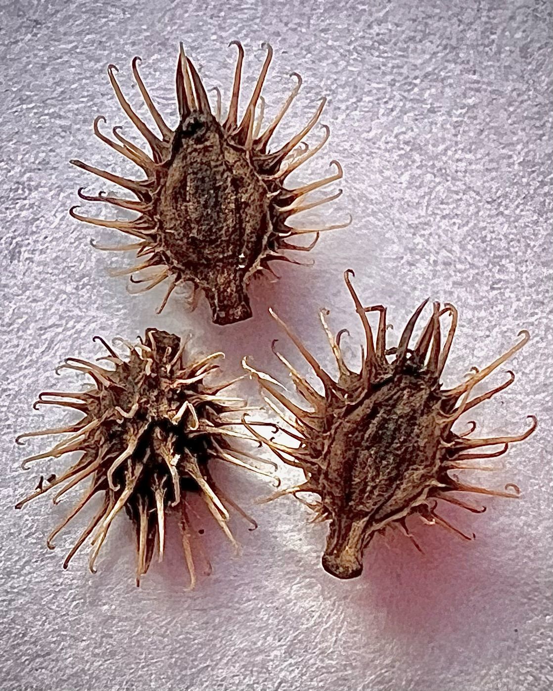 Thus, the success of a burr depends on its size, weight, and, importantly, the number, length, and shape of its hooks or barbs. These are the little details that determine how readily burrs get stuck to, and unstuck from, animal fur.  Even the position of burrs on a plant affects their likelihood of getting picked up by a passing animal. A good burr is tick-like – sitting at a height on a plant that an animal is most likely to brush against.  Mid-calf is a very popular height for both.