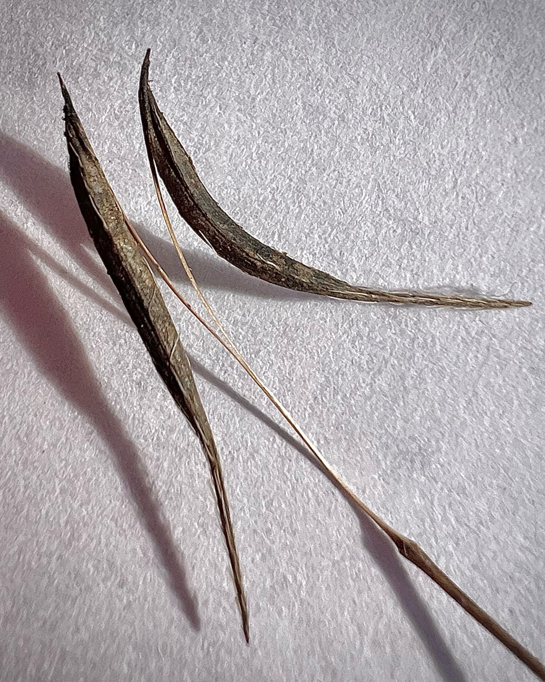 The left photo shows the seeds of Canadian Black Snakeroot (hereafter just "Snakeroot"). I removed these from my pants in late October in Duke Hollow (northern Virginia near the AT).  They were about a quarter-inch long, including the bristles.  Each Snakeroot flower produces two seeds; you can see their flat, inner sides where two in the photo have split apart.  Also notice the hooks on the bristle tips.  The right photo shows a pair of the half-inch-long seeds of Aniseroot.  These banana-shaped seeds were still delicately attached to a stem that was picked in mid-October in Duke Hollow.  They also formed in a single flower and then split apart as the seeds matured.  This was their final resting position, where they waited for the right force to disperse them.
