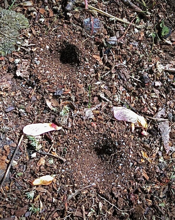 Have you ever wondered what makes funnel-shaped pits in the soil, such as in the left photo? They look like tiny (two-inch-wide) bomb craters. They are typically in sandy or dusty soil, such as at the bases of rock outcrops or large trees, but they could be right next to your house. A group of these pits was found by Andy Wolfe in Michaux State Forest in southern Pennsylvania in May of 2021.