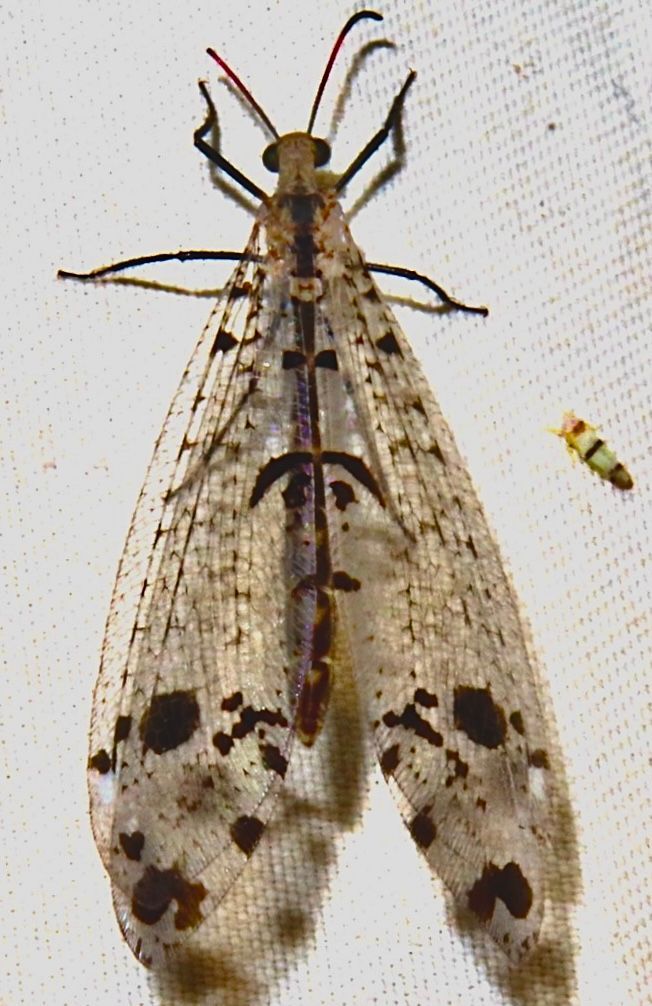 Adult antlions are even more difficult to find than their larvae. In contrast to their larvae, adults are mainly nocturnal. The bottom photo shows an adult Eastern Spotted-wing Antlion (Dendroleon obsoletus). It was found by David Cox near SNP on August 28, 2024. He attracted it to a light at night. It was among the MANY nocturnal insects that landed on a sheet that was hung under the light. This insect was about 1.5 inches long, with a two-inch wingspan.
