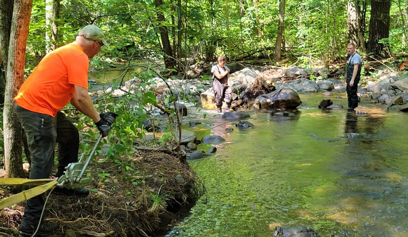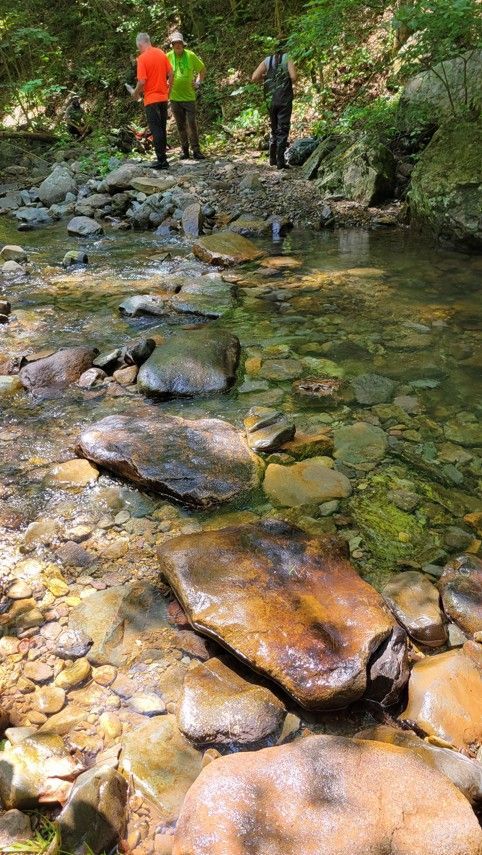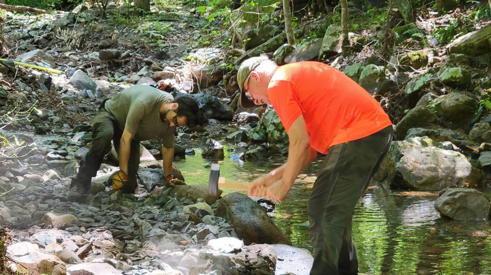 Still, the crew considered cancelling the work week. However, our NPS colleagues had a plan that had one PATC crew working in Jeremys Run for a couple of days, then another day in Buck Hollow Creek. Literally “in.” The cool waters of the mountain streams helped keep moderate temperatures and allow the joint crews to work. On Tuesday the 24th, for example, the temperature in nearby Luray was over 101, yet the temperature at the worksite in Jeremys Run stayed in the mid-80s.