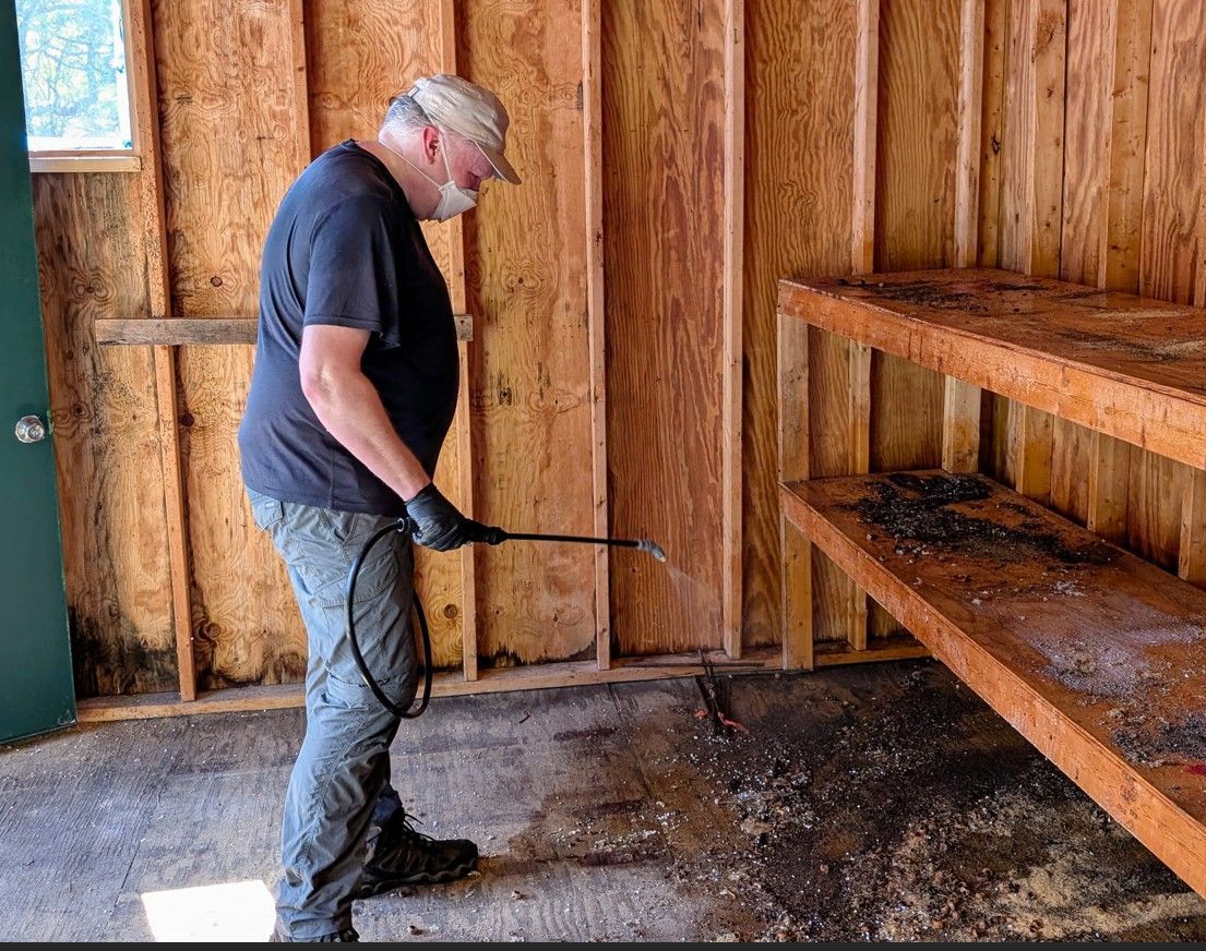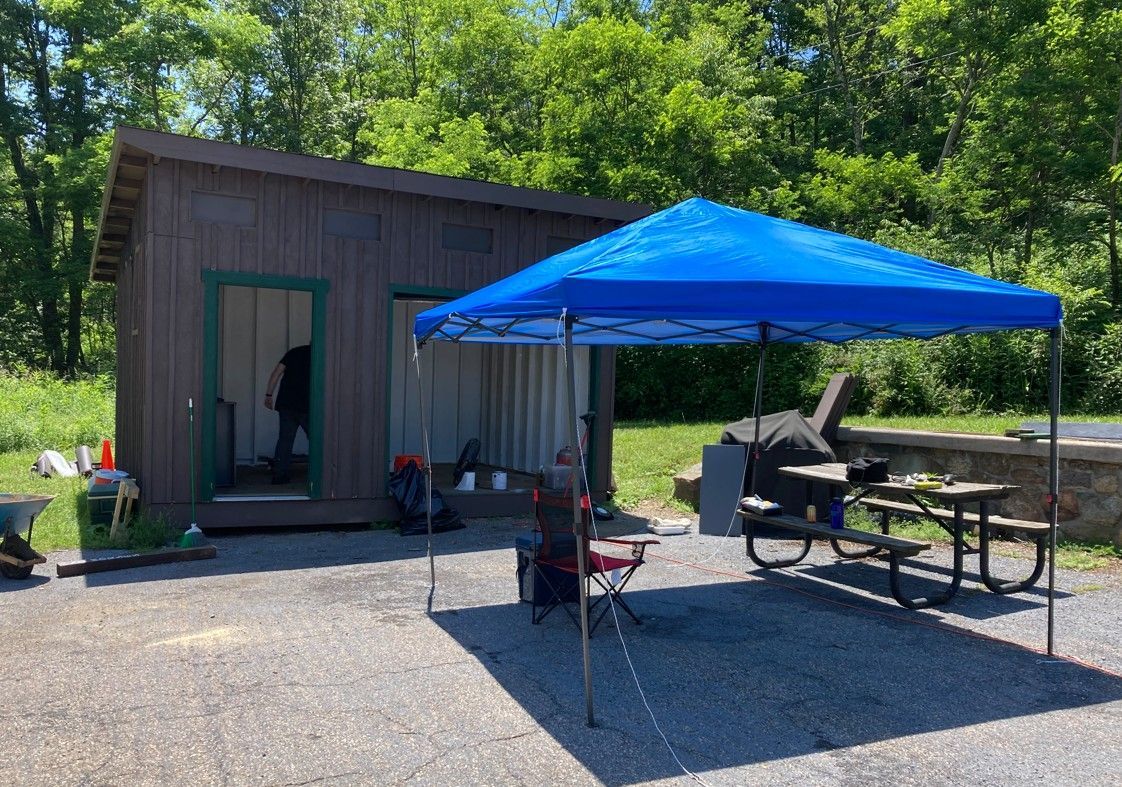 Unsure of what the week would bring beyond sweltering temperatures, Noel Freeman and Wayne Limberg continued to work on the big shed at Piney River. With the mouse infestation under control, they removed old shelving and began painting the interior of the shed and filling holes and gaps in the siding, tasks which pretty much took the remainder of the week. Greg Foster joined them on Wednesday to help get them over the hump. Even with a canopy and fans it was hot work.