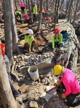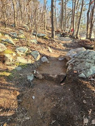 Heading south from the overlook, the trail went over a root mass and then steeply downward before heading steeply up again. Most hikers went around this section through some loose rocks and up the severely eroded trail. On this beautiful weekend, we wanted to change that. We broke into six teams working on small sections of the trail. Four teams built stairs and grade dips. Another team made gravel to fill in around the stairs and the finish team found mineral soil to spread over the gravel to complete the tread.