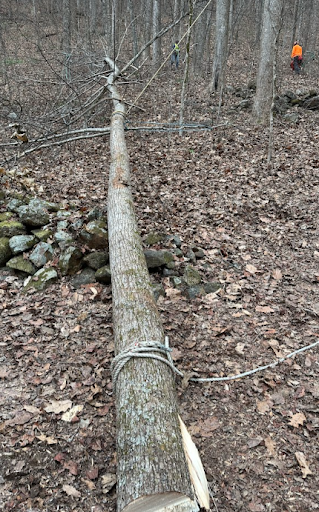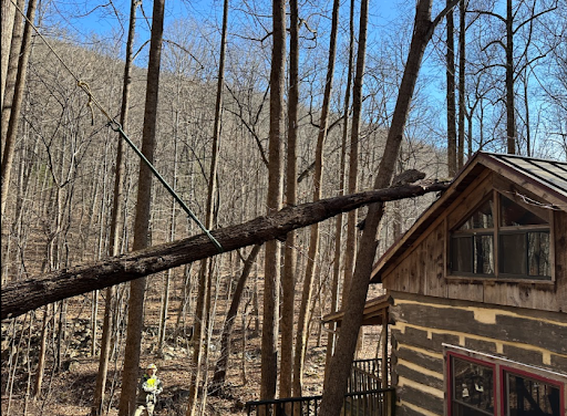 Phase two of the operation was to take down the tulip poplar leaning over the cabin.