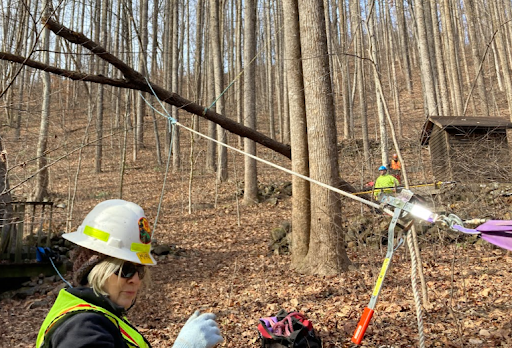 Having assessed the situation, unpacked a truck load of rigging and saw gear, and having completed a safety review, we got started on setting up the gear (photo 3).
