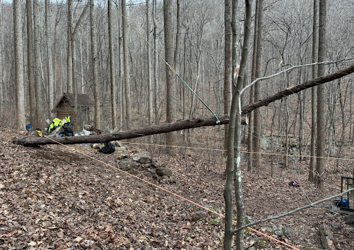 Justin, Russ, Steve, and Mark relocated the other grip hoist and a redirect block up the hill away from the cabin to which was connected a second pulling line. The goal being to make sure the falling tree fell away from the cabin, into the only open area available. To keep the butt from kicking off the stump and into the cabin a few feet away, the Maasdam was set up and attached to the butt to create a restraint.