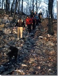 "Anyway, we kept pushing the Trail and we had to pick old wood roads and faint mountain paths. We couldn't pick the perfect route then because it was too tough. Remember, between Harpers Ferry and Bluemont there was at that time no decent road through Keys Gap-only a cart path. You could get up on the west side, but you had to have a high-hung car. Just to show how difficult it was: You had to go to Harpers Ferry, drive quite a distance on a dirt road to Millville, and get a mountaineer out of his cabin to take you across the river by a hand-operated ferry. Finally, you would get to the top of Keys Gap if your car was high hung. If it wasn't you never got there. You couldn't get up the east side; there was no road through to Charles Town. We worked from both ends-from Bluemont and from Harpers Ferry. I remember one trip in February westarted on Sunday morning and it was nearly twelve o'clock noon before we arrived at Keys Gap. We were working near the Deer Lick and the Trail was really bad. By the time we walked to the Deer Lick it was three-thirty or a quarter of four, and we figured we had only fifteen minutes to work before we had to start back. It started to sleet and the sole came off my shoe and there I was. We put in fifteen minutes of hard work and had to race to get back to Keys Gap before dark. The Trail was so bad and it took so much time to walk in that we were convinced we couldn't get much work done when we started from Washington on Sunday morning.