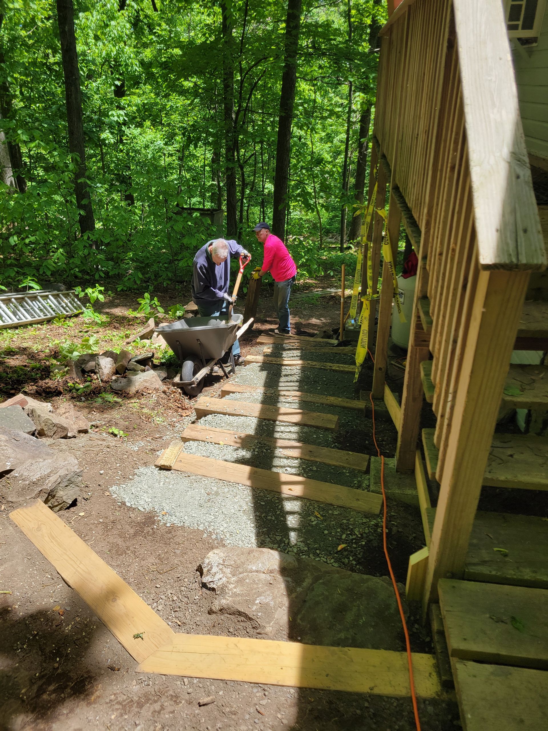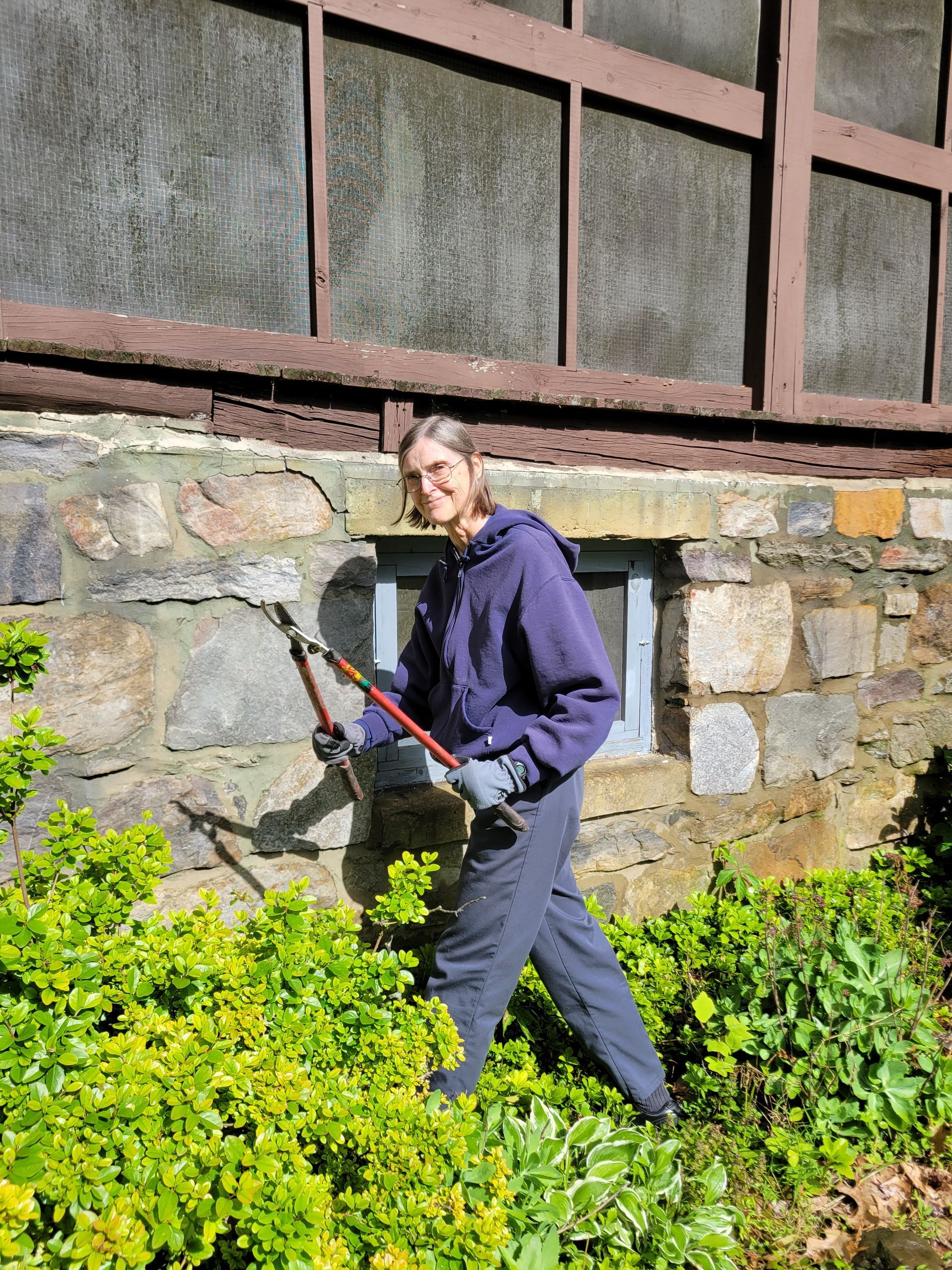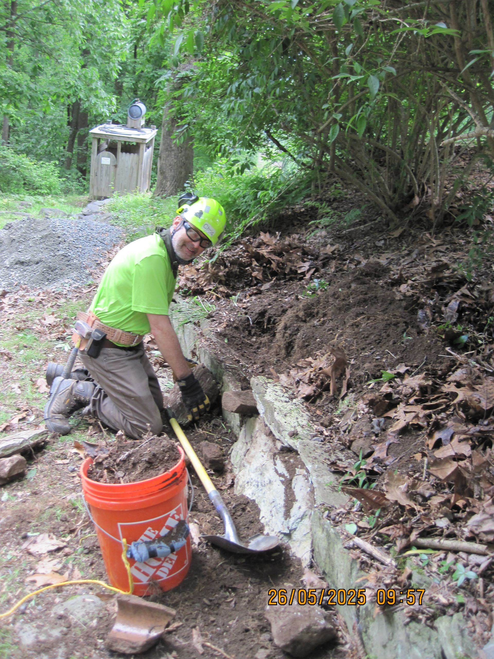 Yard mission members (JT, Barbara, Dan Feer, Aidan Badwhar, Sandi Marra, Chris Brunton, Lynn Olsen, and Chris Glembocki) tackled raking accumulated leaves off the roof, removing vines from porch screens, trimming low-hanging tree branches, hedge-trimming of overgrown shrubs, dead-heading of blooming bushes, removing leaves packed against the hiker cabin foundation, clearing of leaves and debris from a road culvert to help control erosion of the road, and excavation and partial reconstruction of a collapsed low rock retaining wall along the driveway.
