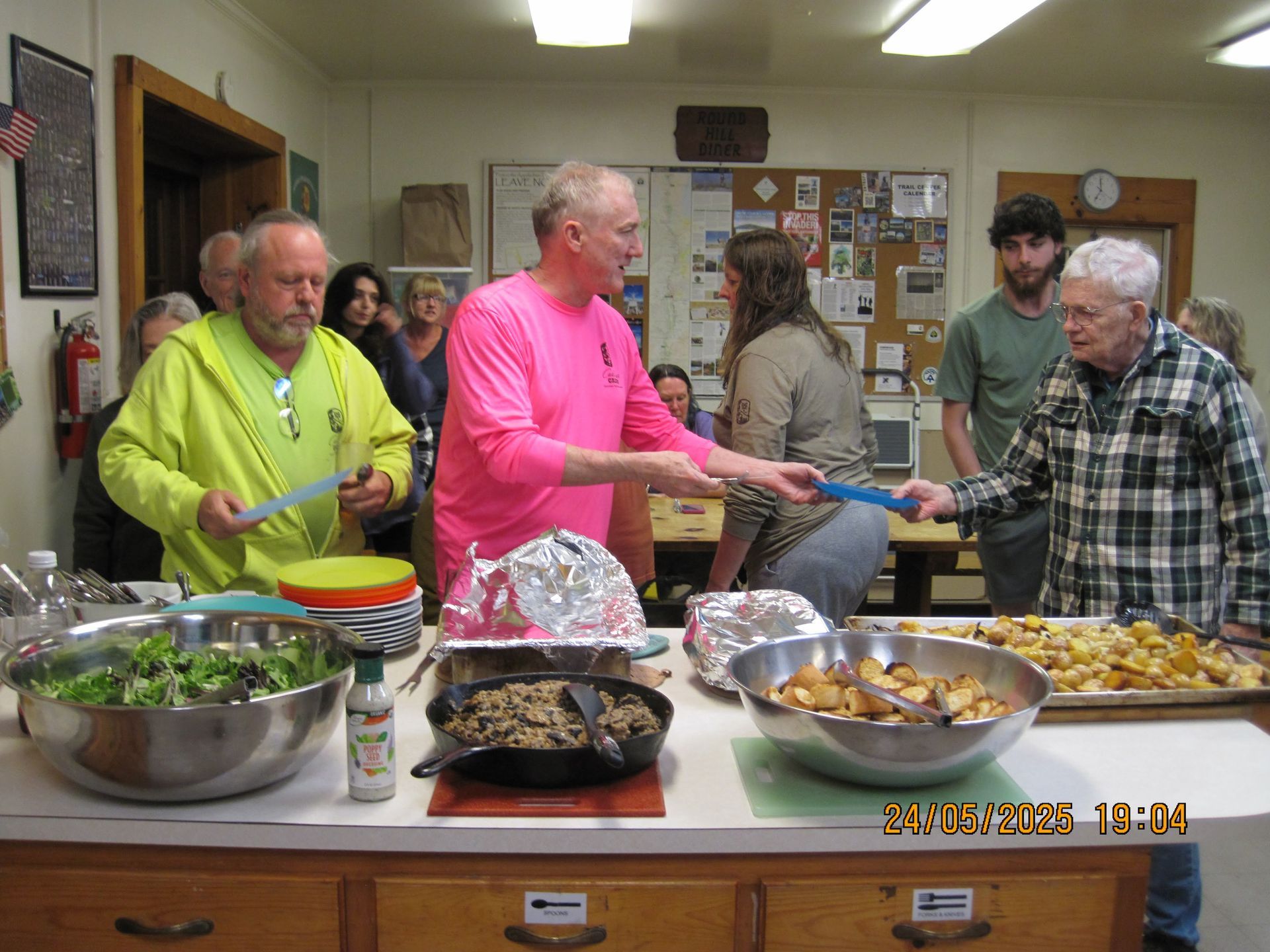 Is it the weekend’s great selection of food that keeps us coming back? Our longer work trips require potluck meals and happy hour snacks. Starting with Saturday’s dinner main entrée of Porchetta cooked by Sandi Marra (the ATC president) which fed not only the crew but several fortunate thru hikers and continuing with the Sunday’s main dinner vegetarian entrée of Butternut Pecan Sweet Potato Casserole cooked by Ellen Shaw (and assisted by her returning college student son, Aidan), the crew members highlighted their culinary skills in the well-appointed Blackburn kitchen.