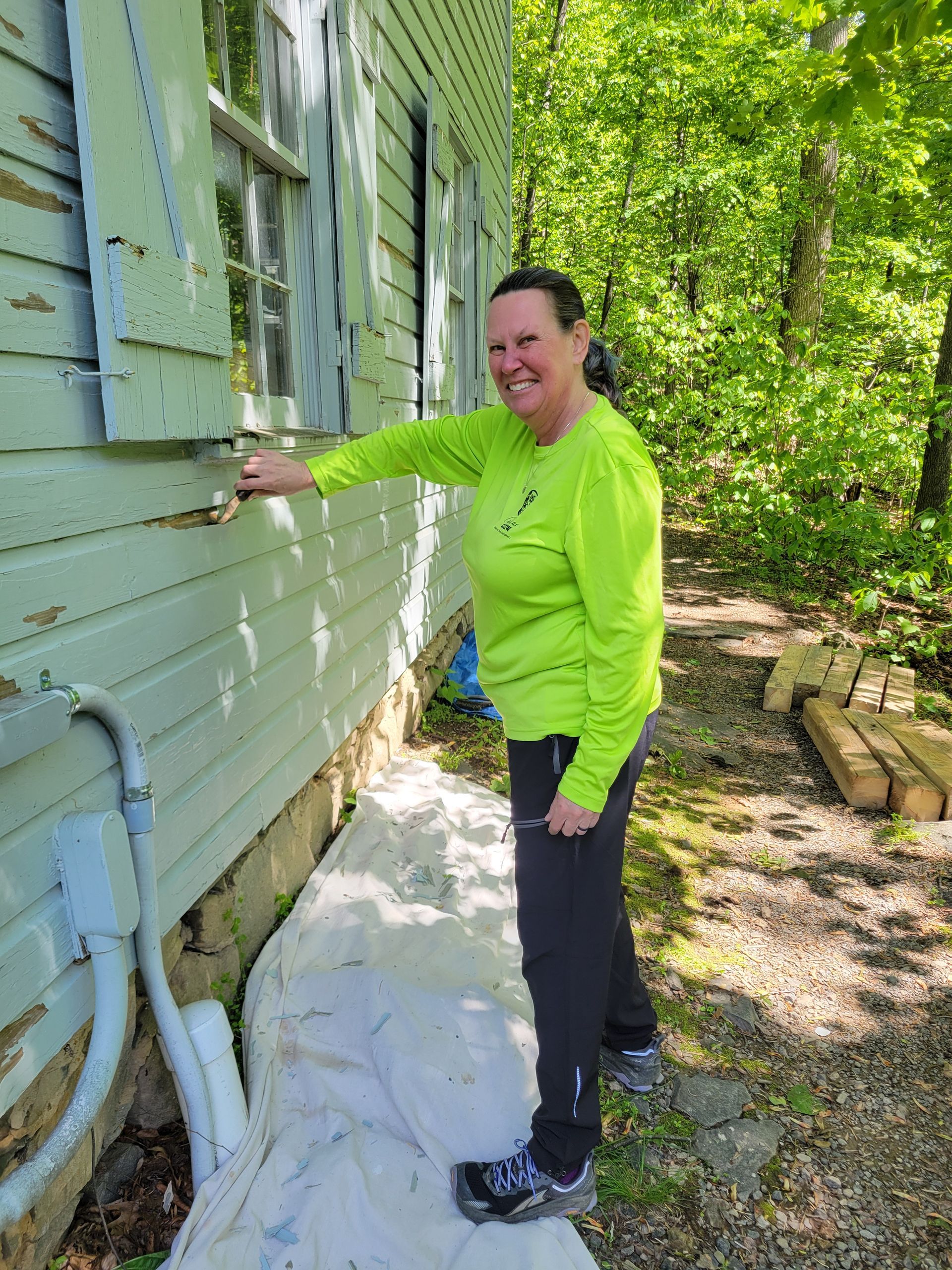 Heading up the trail center work, Barbara Cook and John Kittridge managed a list of continuing maintenance with Cat Randall and Janet Arici giving the new front entrance stairs two coats of paint blending them in beautifully with the dark brown of the porch. Janet and Cat, along with Ellen Shaw and Erica Glembocki, scraped and touched up some of the weathered paint on the carriage house siding. Jonathan Robertson, Steve Barber, and John installed trim casing on a new window on the ridge runner apartment. Steve, John and Jonathan also installed a new hiker cell phone charging station on the porch, including a new set of electrical outlets and a shelf for the phones (since most hikers approaching the trail center ask first for water and then for a place to charge their devices!). They also addressed modifying non-closing porch and privy doors.