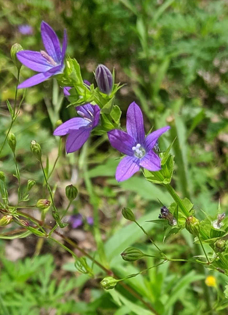 Venus’ Looking-glass (Triodanis perfoliata), has starry purple/blue flowers. Its leaves are small and round and clasp the stem, forming a little cup, and the flowers sprout out of axils of these leaves. The plant is usually about 12 inches tall.