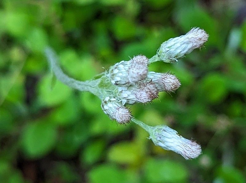 Plantain-leaved Pussytoes (Antennaria plantaginifolia) have fluffy, white flower heads atop straight stems up to a foot tall. It is dioecious, which means each plant has unisexual flowers with staminate (male) and pistillate (female) flowers on separate plants. The sexes tend to grow in separate clumps. The male flower head can be up to an inch across and consists of many, tiny, tubular, white flowers with yellow/brown, clumped stamens protruding from the middle of each flower. The female flower head is much narrower and most of what you see are hairs that will eventually help the seeds disperse in the wind. Plantain-leaved Pussytoes has wide basal leaves (greater than 1.5 centimeters) with multiple veins. These big leaves often lie on the ground. The whole plant is wooly, making the green of the leaves look very pale.