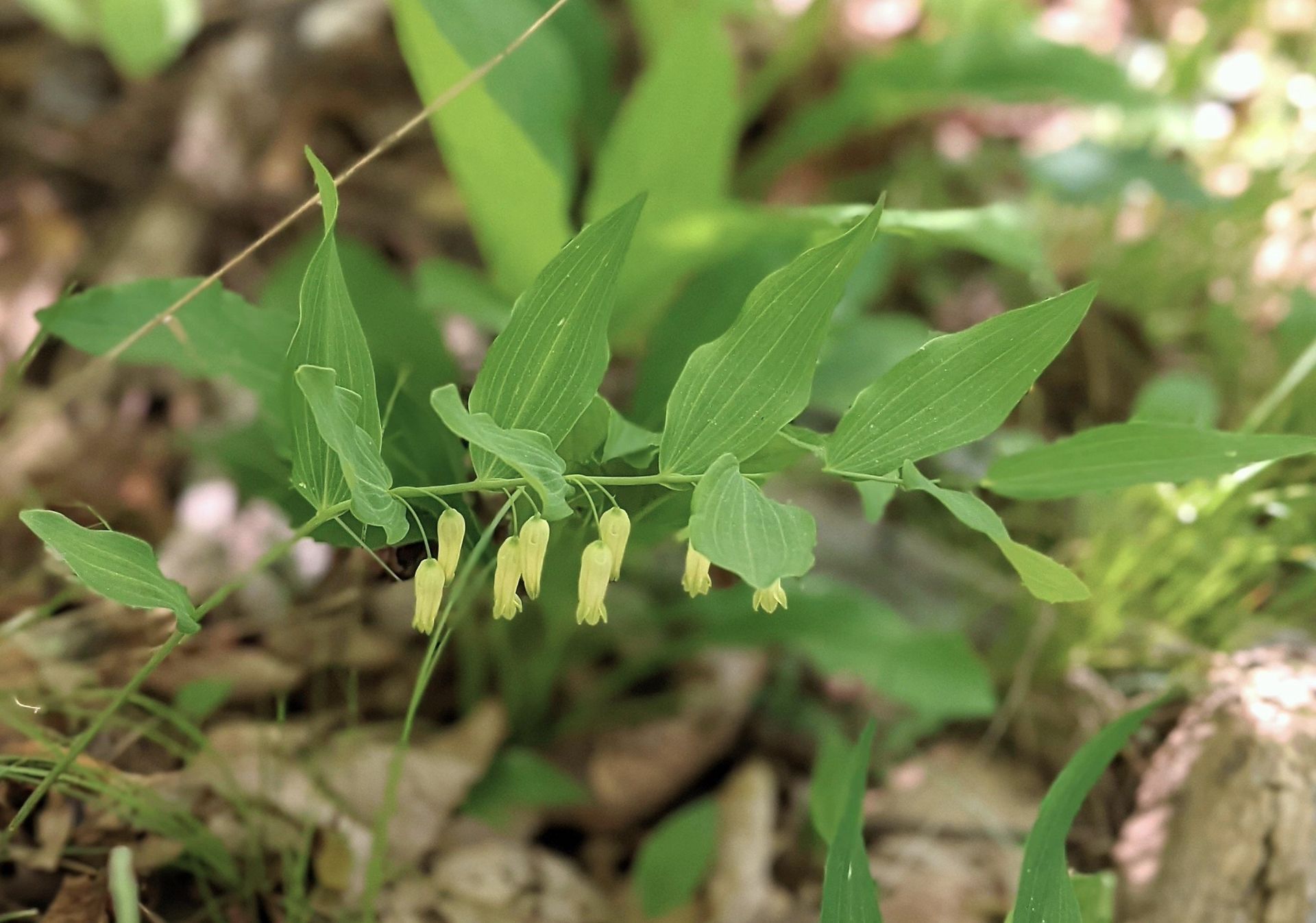 Solomon’s Seal (Polygonatum biflorum) plants have a single erect or arching stem with several ovate leaves alternating along the stem. The leaves have no stem and have distinct, parallel veins. Flower clusters hang down from the leaf axils, so you must look under the plant to see them. They are shaped like elongated bells with six pointed lobes at the tip. They are greenish white or tinged yellow.