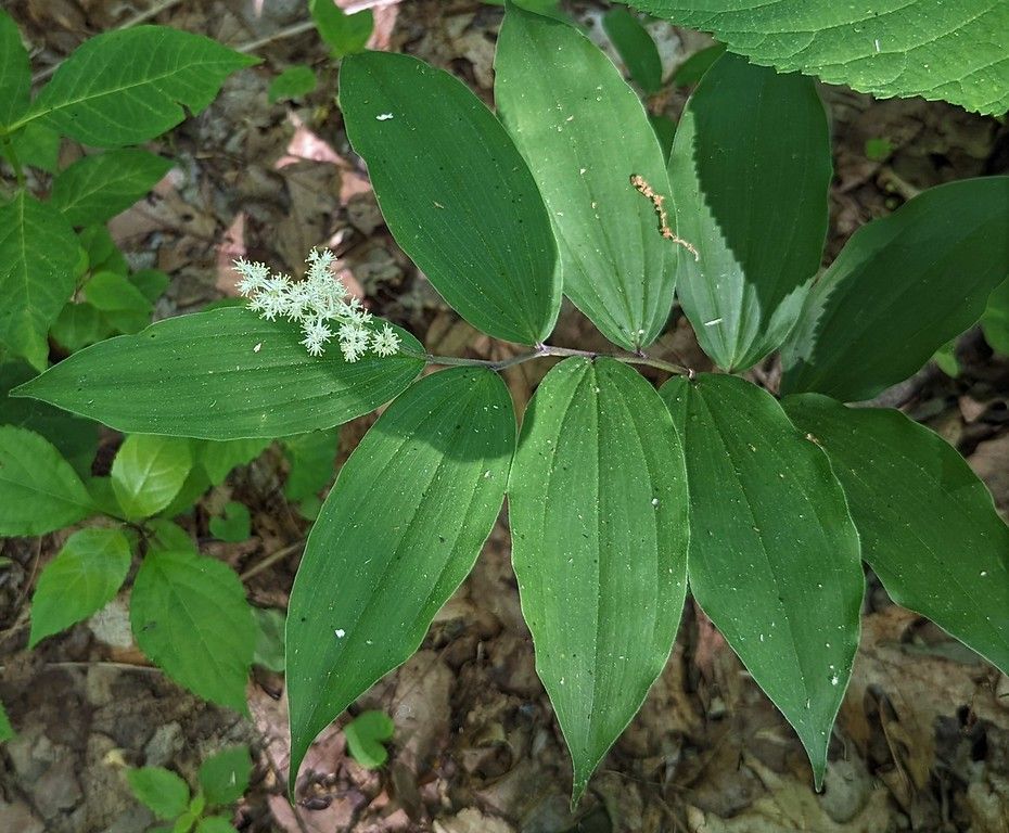 False Solomon’s Seal aka Solomon’s Plume (Maianthemum racemosum) plants are like Solomon;s Seal, but the flower clusters grow at the end of the stem. The flower cluster is branched and pyramidal. The individual flowers have six tepals but are only about an eighth of an inch across. (When petals and sepals look alike, they are called tepals.)
