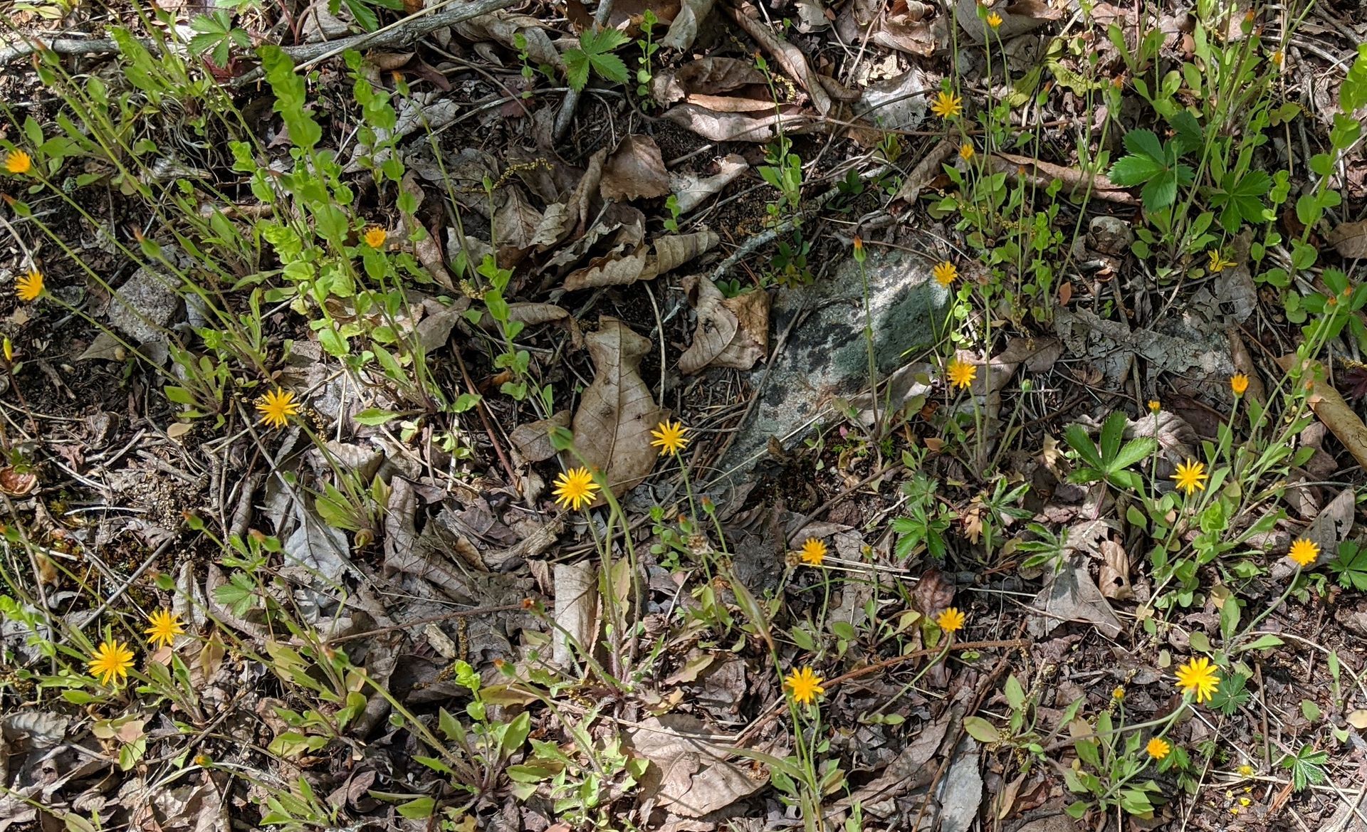 A Dwarf Dandelion (Krigia virginica) may be taller than a Dandelion, but the flower heads and leaves are smaller and the stems are spindly. Each Dwarf Dandelion plant has many stems, so it looks like a forest compared to the separate or single stems of Dandelion. Each leafless stem has only one flower head. Like a dandelion the flower head has only ray flowers and is yellow.