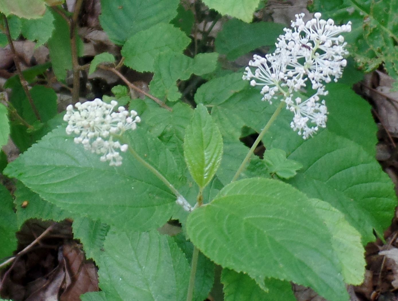 New Jersey Tea (Ceanothus americanus) is a small (up to 42 inches) shrub. It has alternate, simple, toothed leaves. Cylindrical clusters of tiny white flowers grow from axils at the top of the shrub. Pollinated flowers develop into small black fruits.