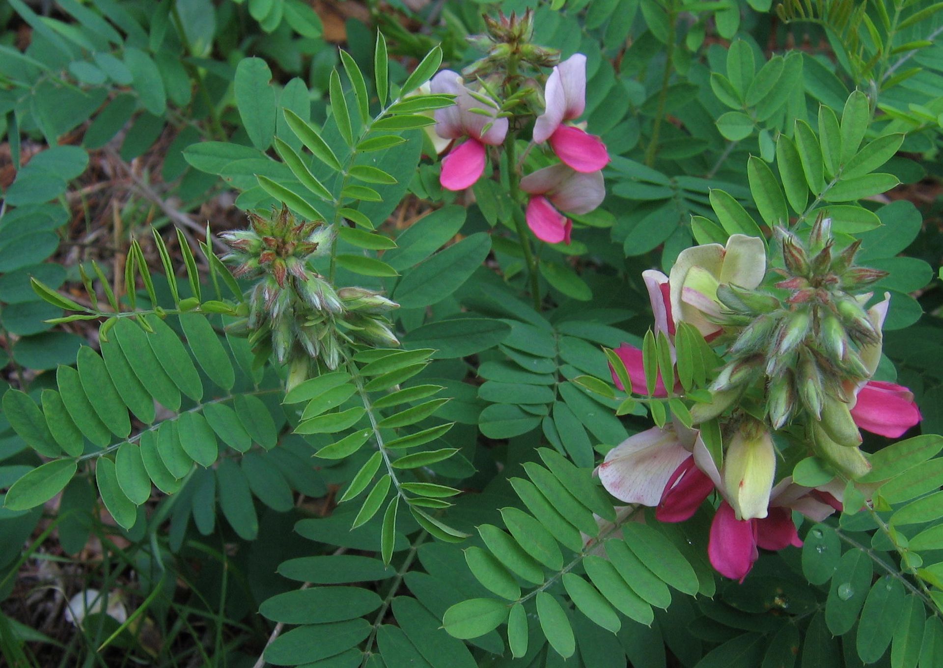 Goat’s Rue (Tephrosia virginiana) have typical pea flowers. The upright banner of the one-half to three-quarter-inch flower is white to light yellow, forming a background to the bright pink joined petals called a keel. One or more flowers appear among the leaves at the end of branches. The leaves are pinnate (resembling a feather with leaflets on opposite sides of an elongated axis).
