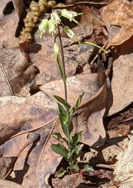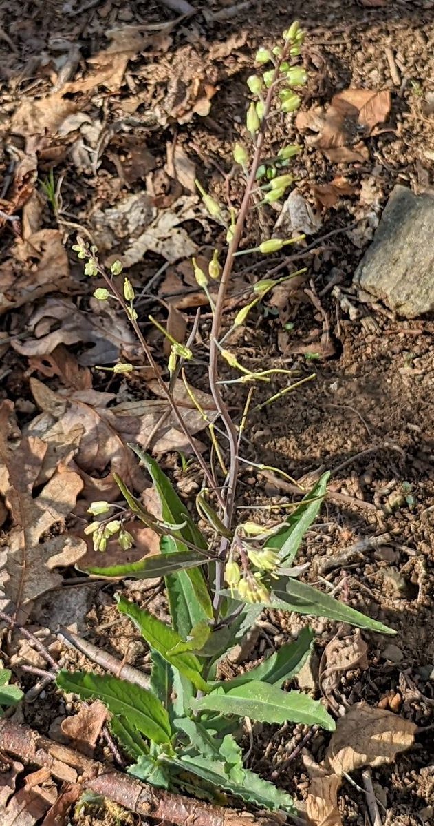 Rock Cresses (Boechera genus) have small, four-petal, white flowers (less than quarter inch). They are tubular, flaring at the tips. Smooth Rock Cress (Boechera laevigata) has a smooth stem with entire or slightly toothed leaves that clasp the stem. The long, narrow fruits are flattened and tend to point upward. Sicklepod (B. canadensis) may be smooth or hairy at the base. The stem leaves narrow at both ends and may be slightly toothed. The long, flattened fruits curve down like a sickle.