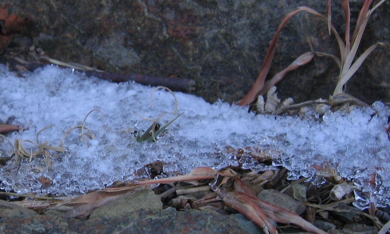 An ice ribbon, frost flower, or ice flower is formed when thin layers of ice are extruded from long-stemmed plants. The thin layers of ice are often formed into exquisite patterns, curling into "petals" which can resemble flowers. The sap in the stem of the plants will expand (water expands when frozen), causing long, thin cracks to form along the length of the stem. Water is then drawn through these cracks via capillary action and freezes upon contact with the air. As more water is drawn through the cracks it pushes the thin ice layers further from the stem, causing a thin ribbon or petal to form.