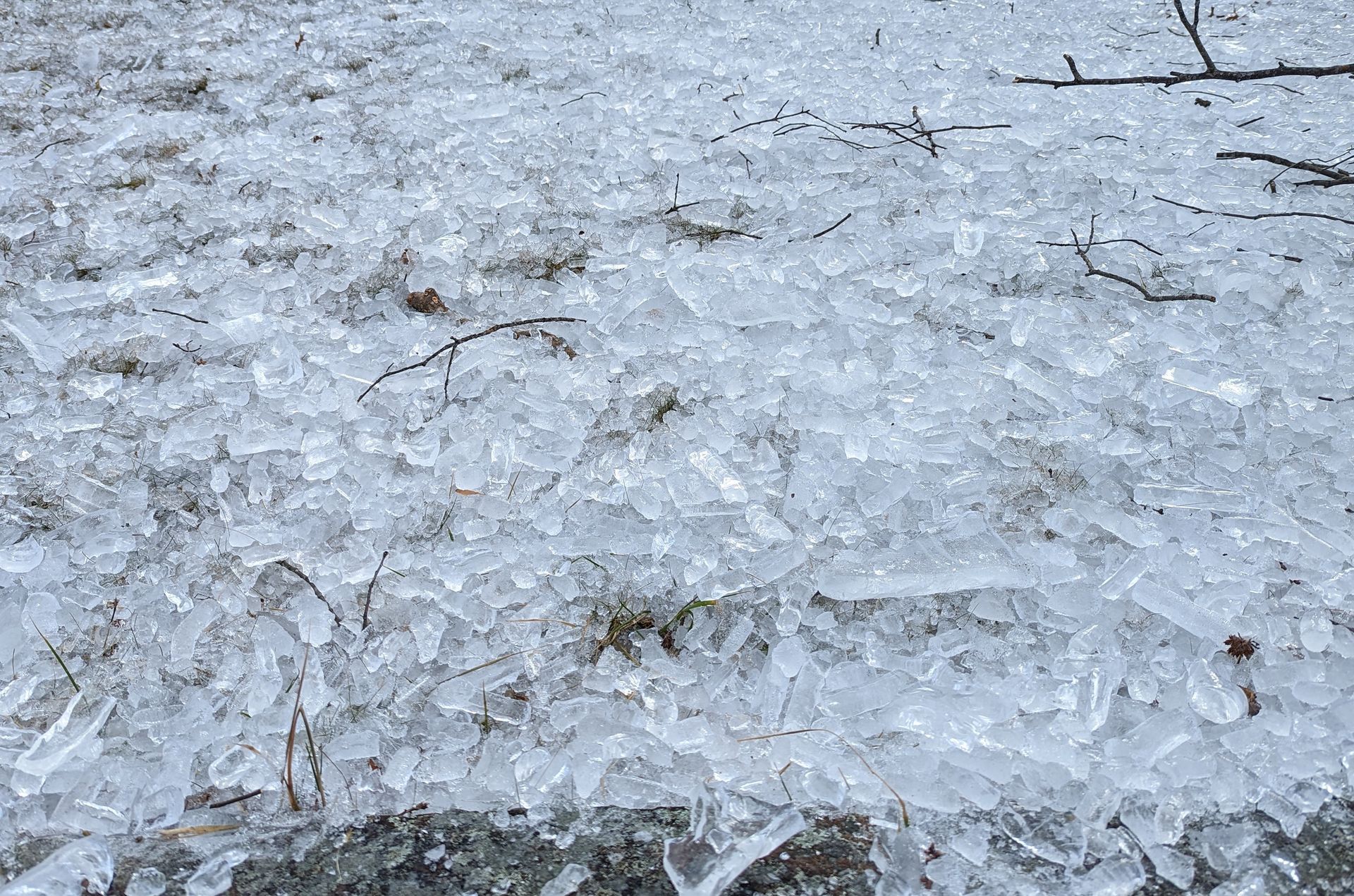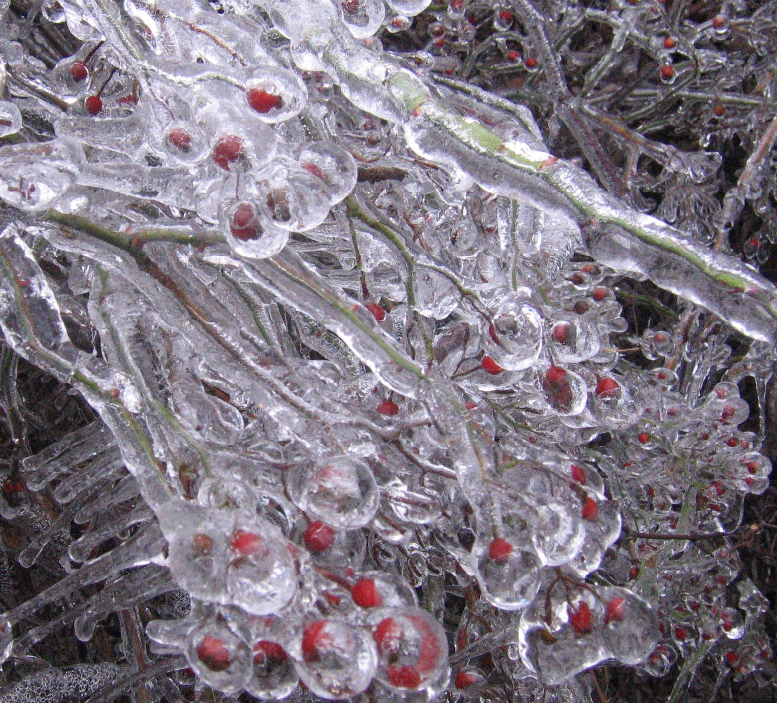 Freezing rain starts out as rain and continues as such until it hits a cold surface and freezes. It freezes clear, and when this happens on a road it’s called black ice, which is an extremely dangerous condition for drivers. Less than a quarter inch of freezing rain on trees can bring limbs or entire trees crashing to the ground due to the weight of the accumulated ice. Beautiful to look at, but to be avoided at all costs.