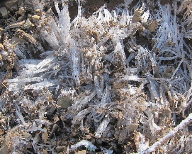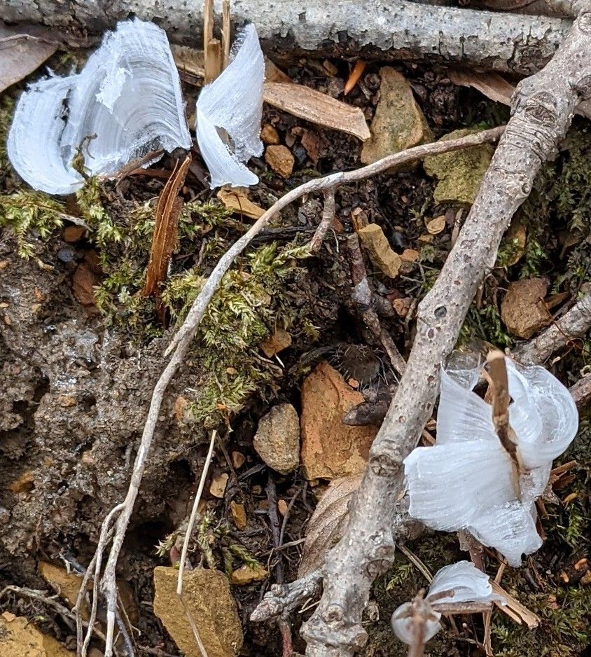 Needle ice is a needle-shaped column of ice formed by groundwater. Needle ice forms when the temperature of the soil is above freezing (0°C/32°F) and the surface temperature of the air is below freezing. Liquid water underground rises to the surface by capillary action and then freezes and contributes to a growing needle-like ice column. For more details see William Needhams “Hikers Notebook” article (https://hikersnotebook.blog/needle-ice-update/).