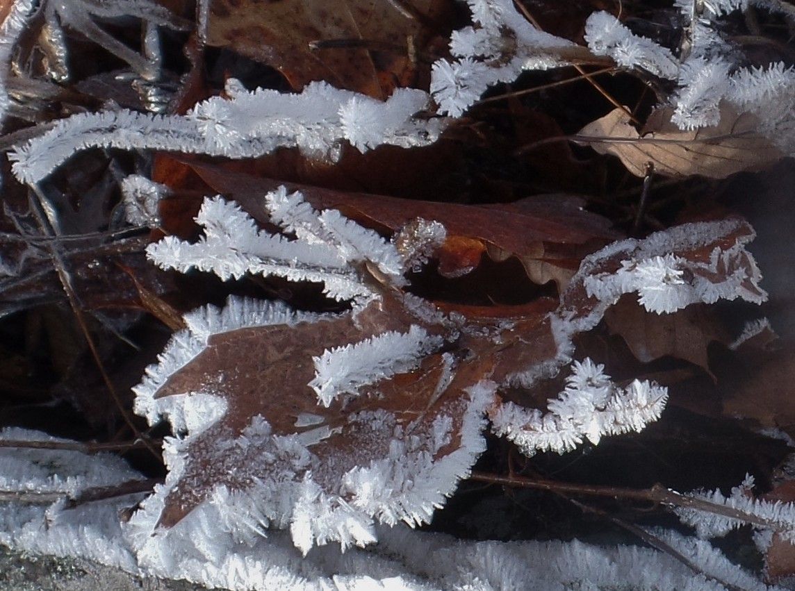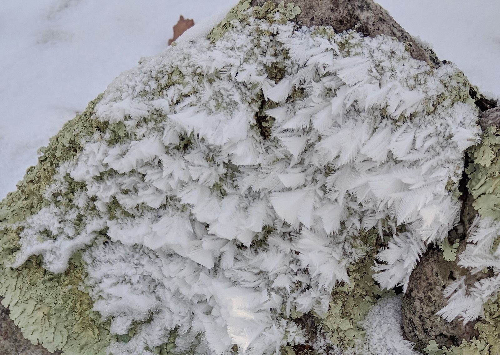 Rime ice forms in foggy or cloudy conditions when the water droplets in the air freeze on cold surfaces. While in the right conditions its crystals can resemble hoarfrost, most occurrences of rime ice will be thicker and will coat the entire surface more evenly. Rime ice crystals tend to resemble feathery snow crystals rather than needles, and, unlike hoarfrost, can build up over time as long as the foggy and cold conditions persist. Hoarfrost doesn’t weigh down its host structure. Rime ice can build up enough to break tree limbs or down power lines.