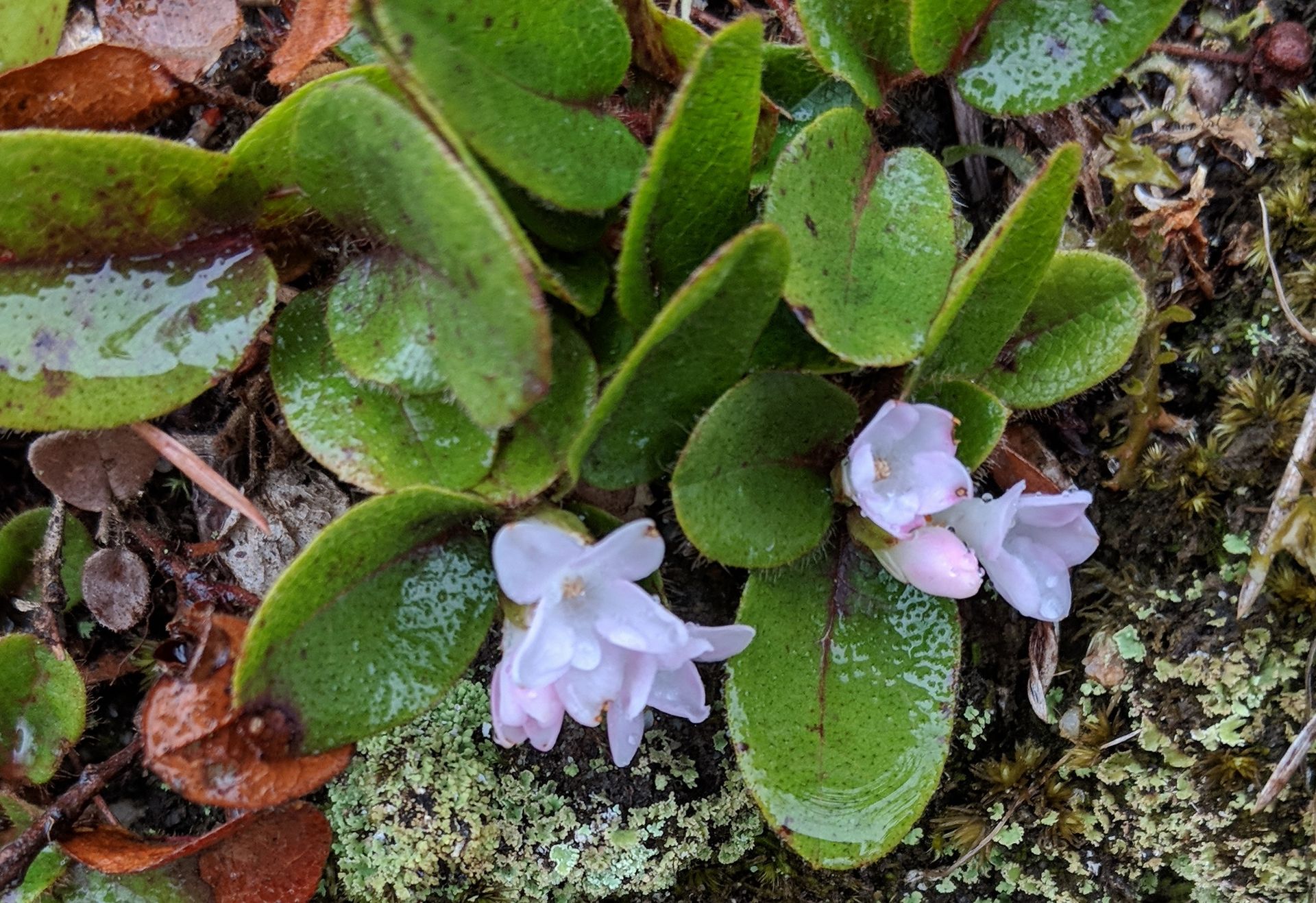 Trailing arbutus (Epigaea repens) plants run along the ground, never more than an inch or two high. It produces clusters of pink to white flowers as early as February. It has shiny, evergreen leaves.
