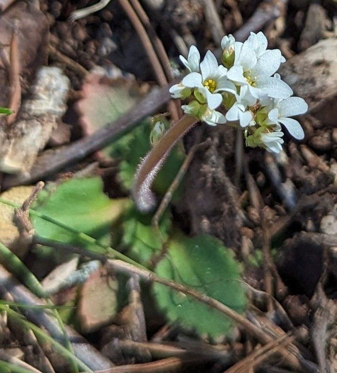 Early Saxifrage (Micranthes virginiensis) erect, branched stems rise above basal leaves. The up-to-three-inch long leaves are egg-shaped, tapering to the stem and toothed at the tips. The 1/4-inch flowers are white spreading from a stem about a foot tall.