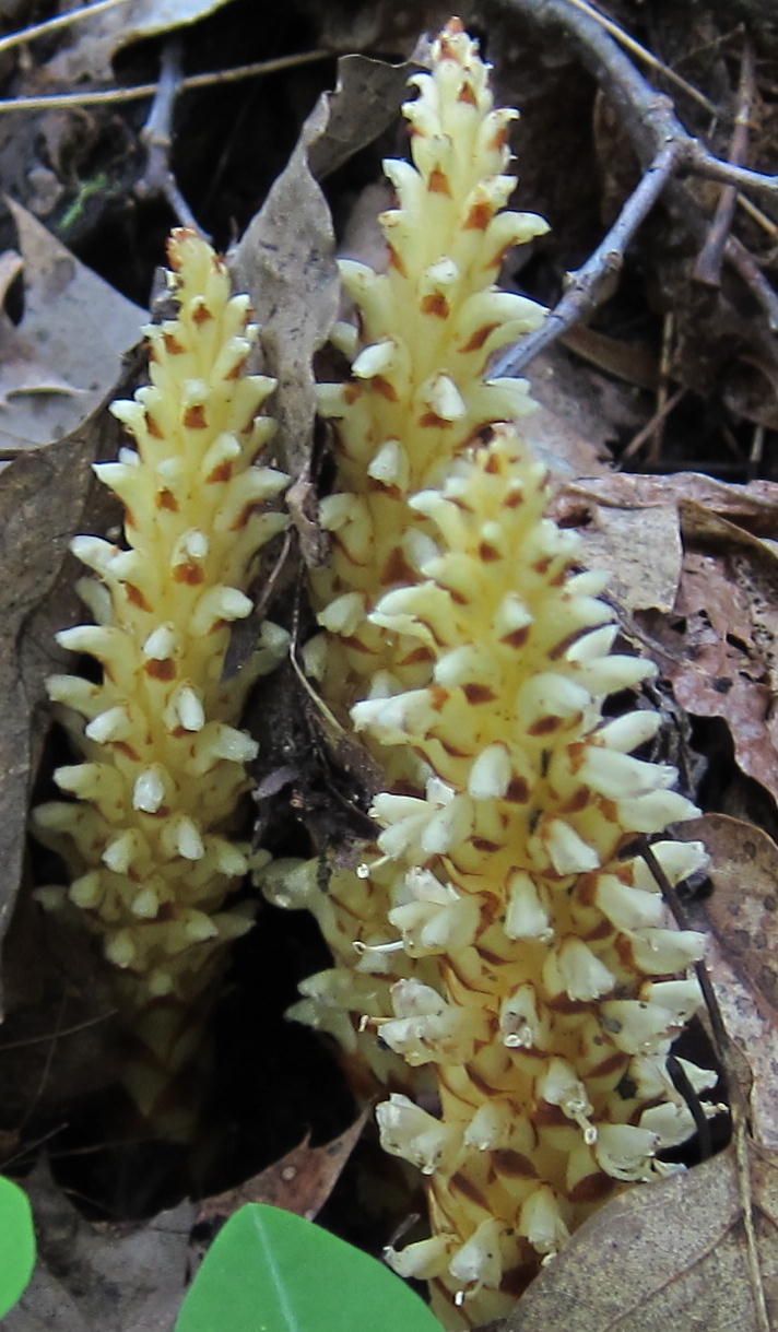 Squawroot aka Bear Corn (Conopholis americana) is parasitic on Oaks. It has no stem or leaves. A fat flower stalk that looks like a pinecone arises from the ground with many cream-colored flowers, each protected by a brown scale.