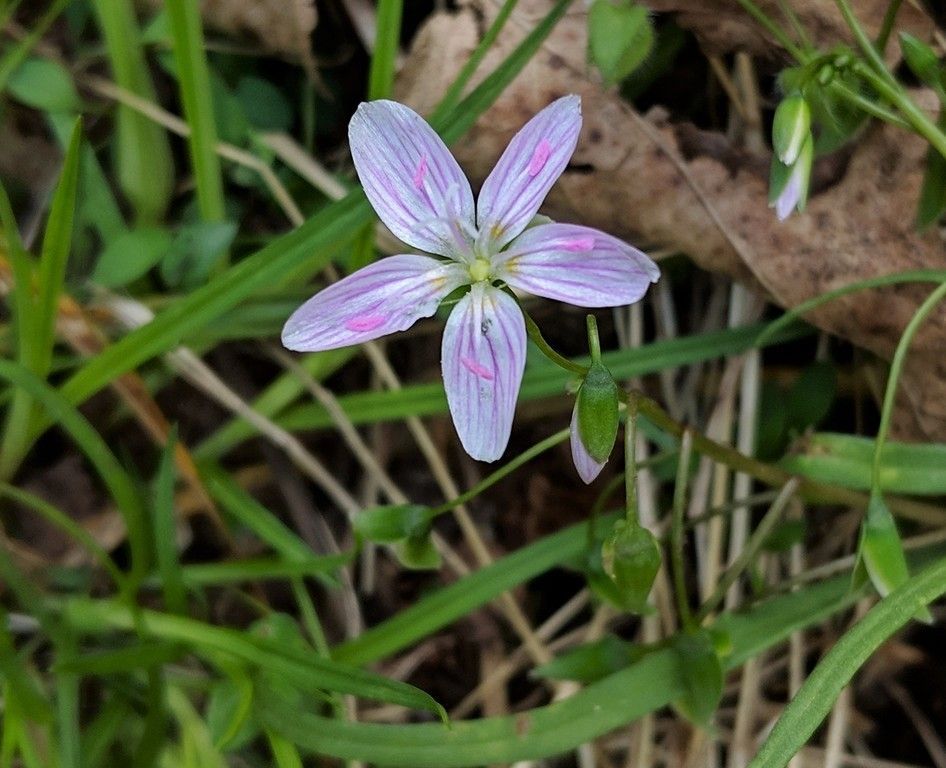 The Spring Beauty (Claytonia virginica) plant is only a few inches high. The flower has five white petals with pink-purple veins and pink anthers. It has strap-like leaves.