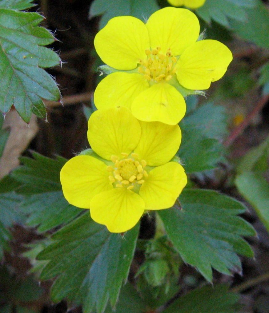 Dwarf Cinquefoil (Potentilla canadensis) half-inch, yellow flowers with five petals. Its leaves have five leaflets with teeth on the edges but not all the way to the stem of the leaflet.