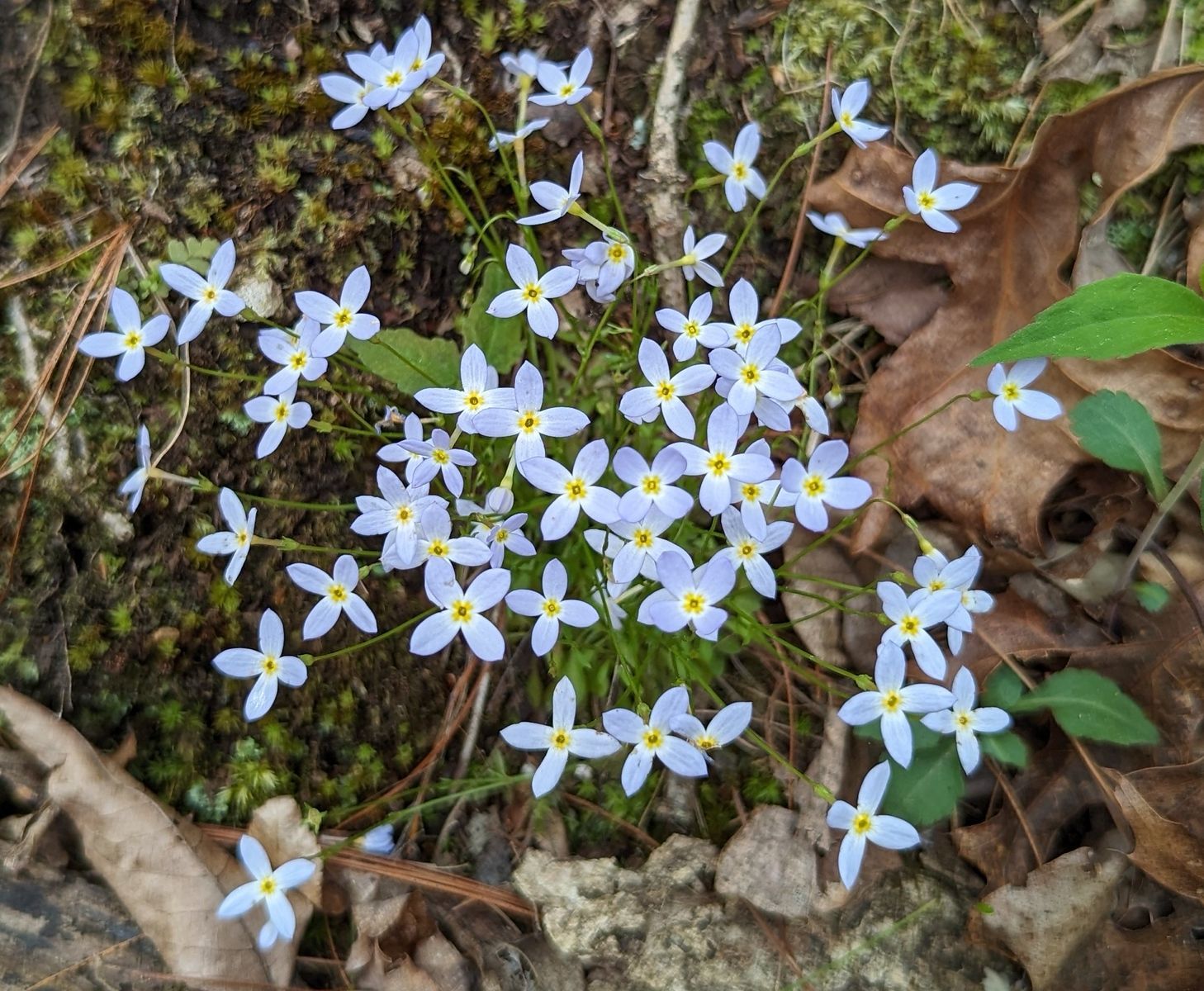 Common Bluets (Houstonia caerulea) are half-inch blue flowers with a yellow center, less than eight inches tall. Each flower is on a single stem. Four petals flare out from a narrow tube presenting a flat top to the eye. The rosette of tiny leaves at the base and even smaller leaves on the stems are hardly noticeable. The blue varies from dark to almost white.