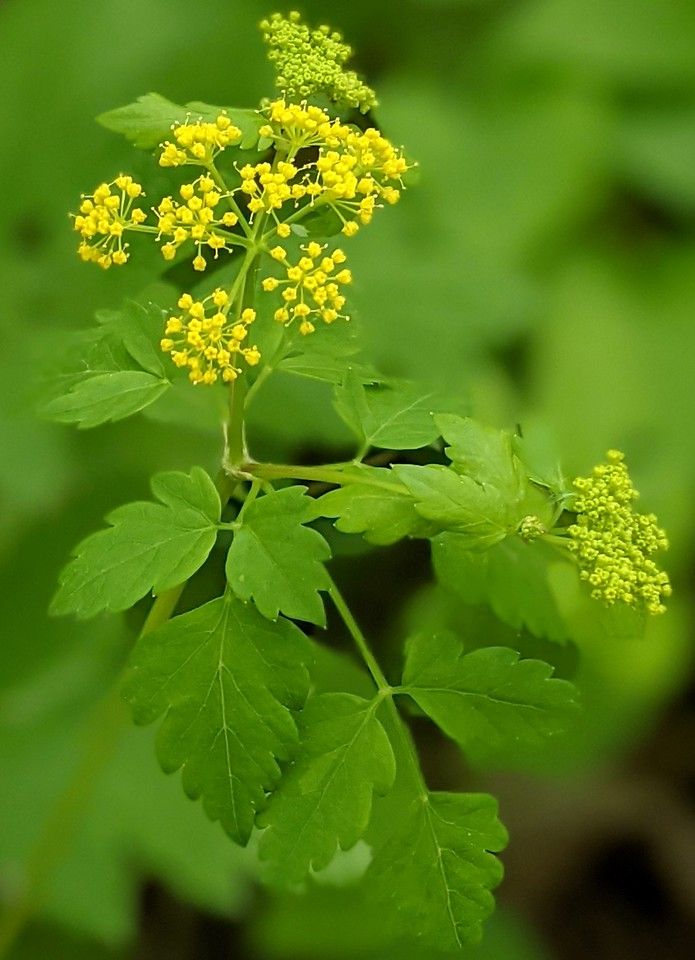 Golden-alexanders (Zizia aurea) have a flat-topped inflorescence with the flower stems arising from a common point like the struts of an umbrella. The tiny flowers are yellow. The leaves are two or three times divided. The leaflets are toothed.