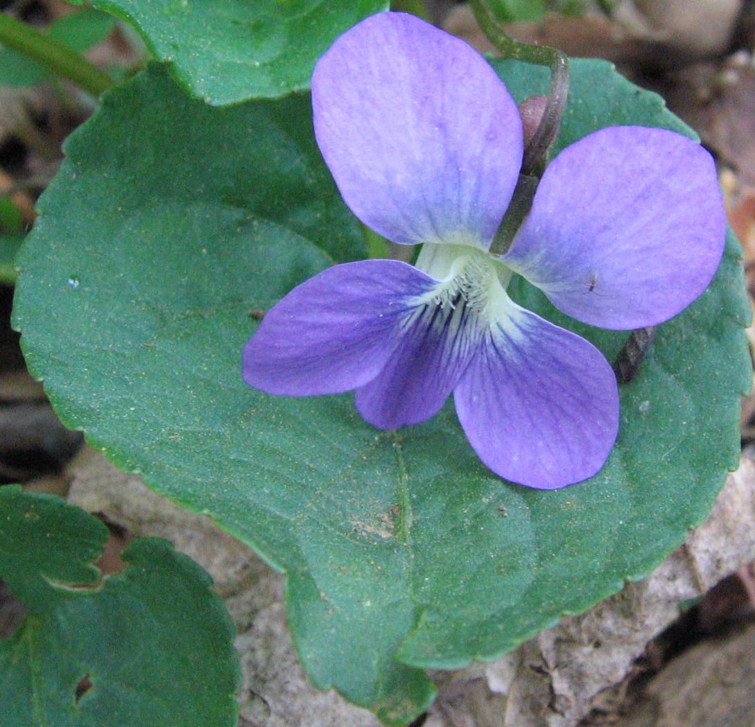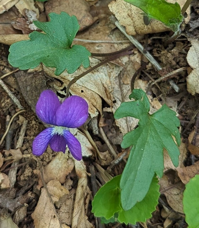 Three Violet species may be seen on this hike. Violet flowers have five petals with the lower petal larger or different-shaped than the side and upper pairs of petals. The plants are usually only a few inches tall with basal leaves. Common Blue Violet (Viola sororia) has 1-inch, blue/violet flowers and heart-shaped, pointed leaves. Wood Violet (Viola palmata) has 1-inch, blue/violet flowers and leaves with many small lobes. Birdfoot Violet (Viola palmata) has flowers that are larger than one inch and have pale purple petals, sometimes with dark violet upper petals, with orange stamens in the middle. The leaves are deeply divided into narrow lobes, like a bird’s foot.