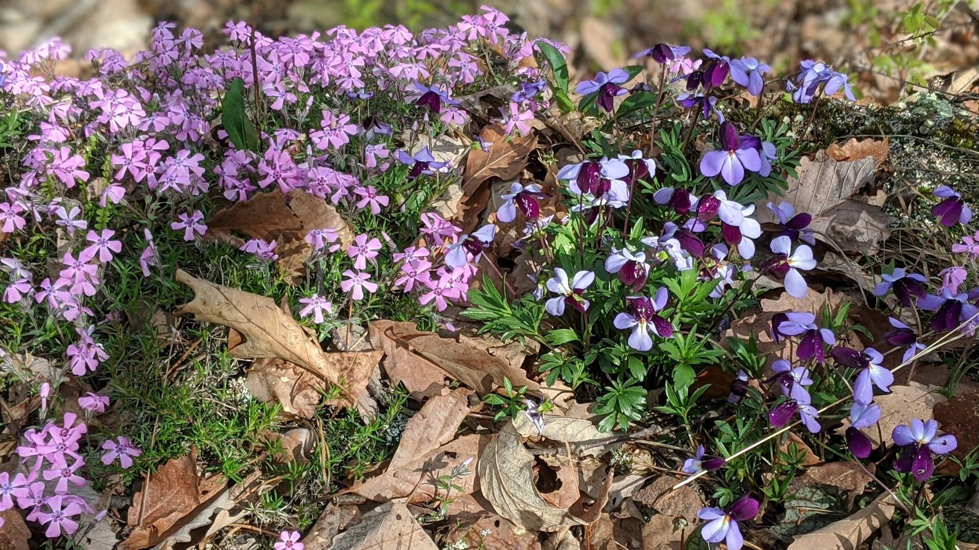 Moss Phlox (Phlox subulata) is low-growing, forming mats. Purple flowers are up to an inch across. Petals flare out from narrow tubes and are notched at the tip. The leaves are entire (no lobes or teeth) and are in pairs, opposite each other.