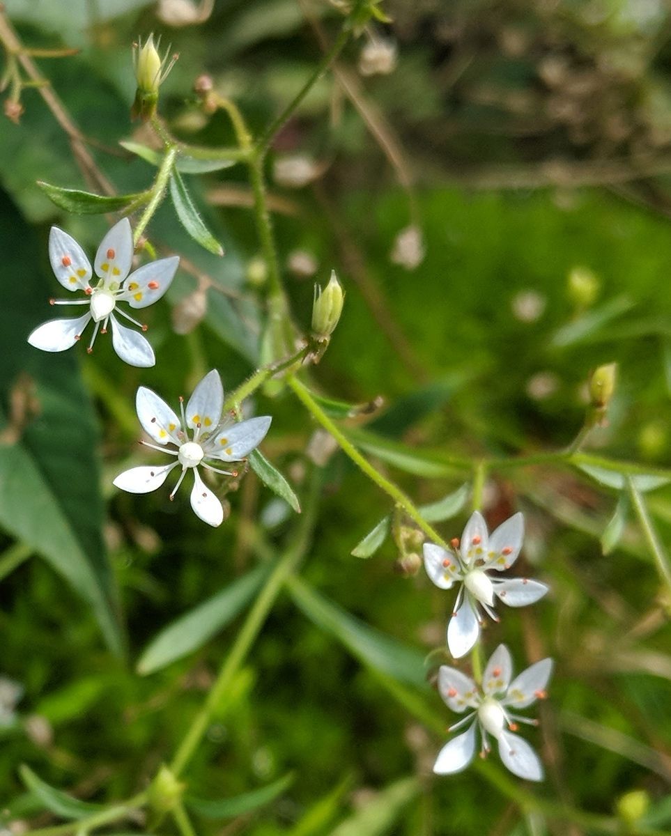 Mountain Sandwort (Minuartia groenlandica) is a northern species as its species name groenlandica (of Greenland) indicates. It is rare in the PATC area, only found on top of Old Rag Mountain where several clumps of it grow in crevices and sandy pavements. It forms mats of leaves that look like little clumps of grass, but, if you look closely, you will see that the individual leaves are fleshy. Flower stems with up to five flowers extend above the leaves. The half-inch flowers have five white petals.
