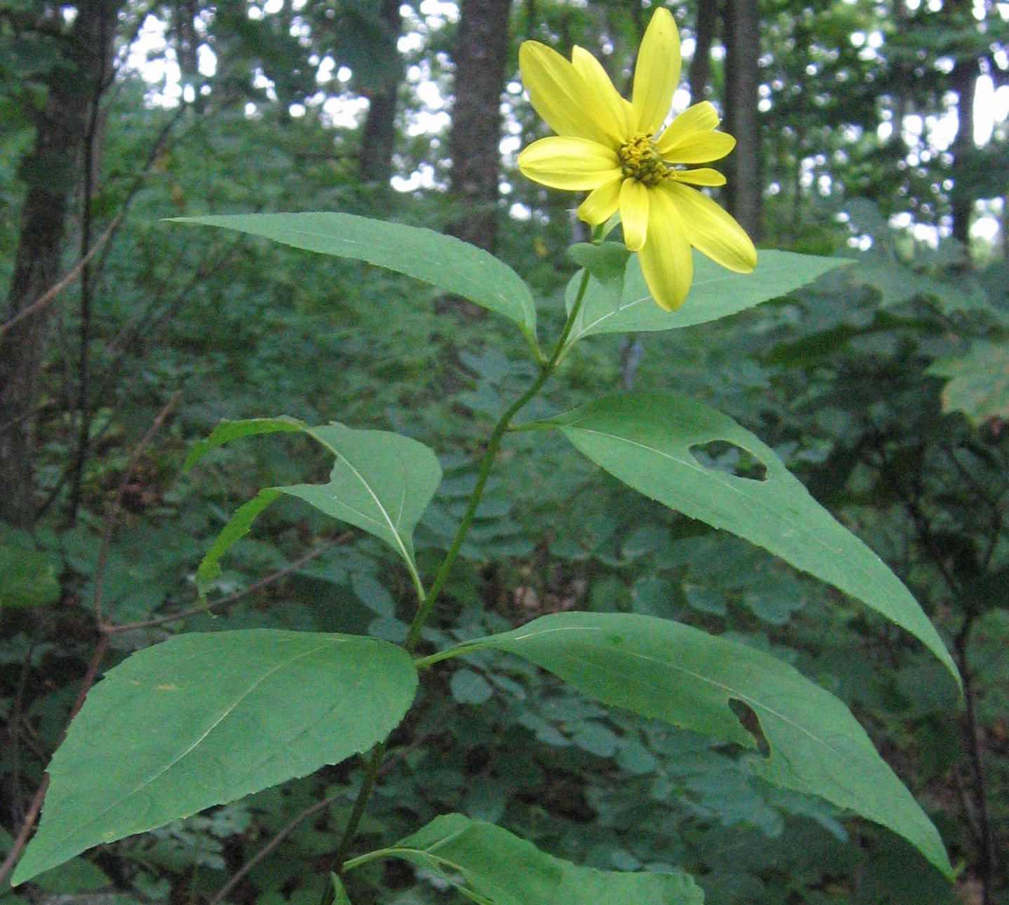 Woodland Sunflower (Helianthus divaricatus) leaves have no stalks. Thin-leaved Sunflower (H. decapetalus) leaf stalks are at least a quarter of an inch long and the leaves are smooth, green underneath, and sharply toothed.