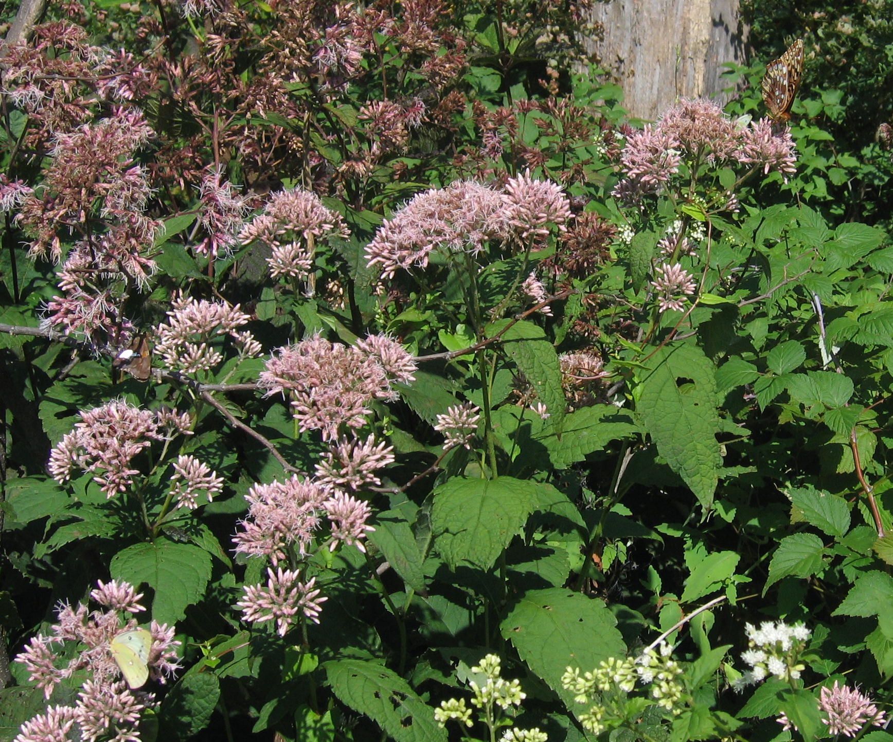 Sweet-scented Joe-Pye Weed (Eutrochium purpureum) is the species of Joe-Pye Weed you will find in dry woods. It has whorls of pointed leaves and the joint where they leave the main stem is purple. Many, small, purple/pink flowers form a dome at the top of the six-foot plant.