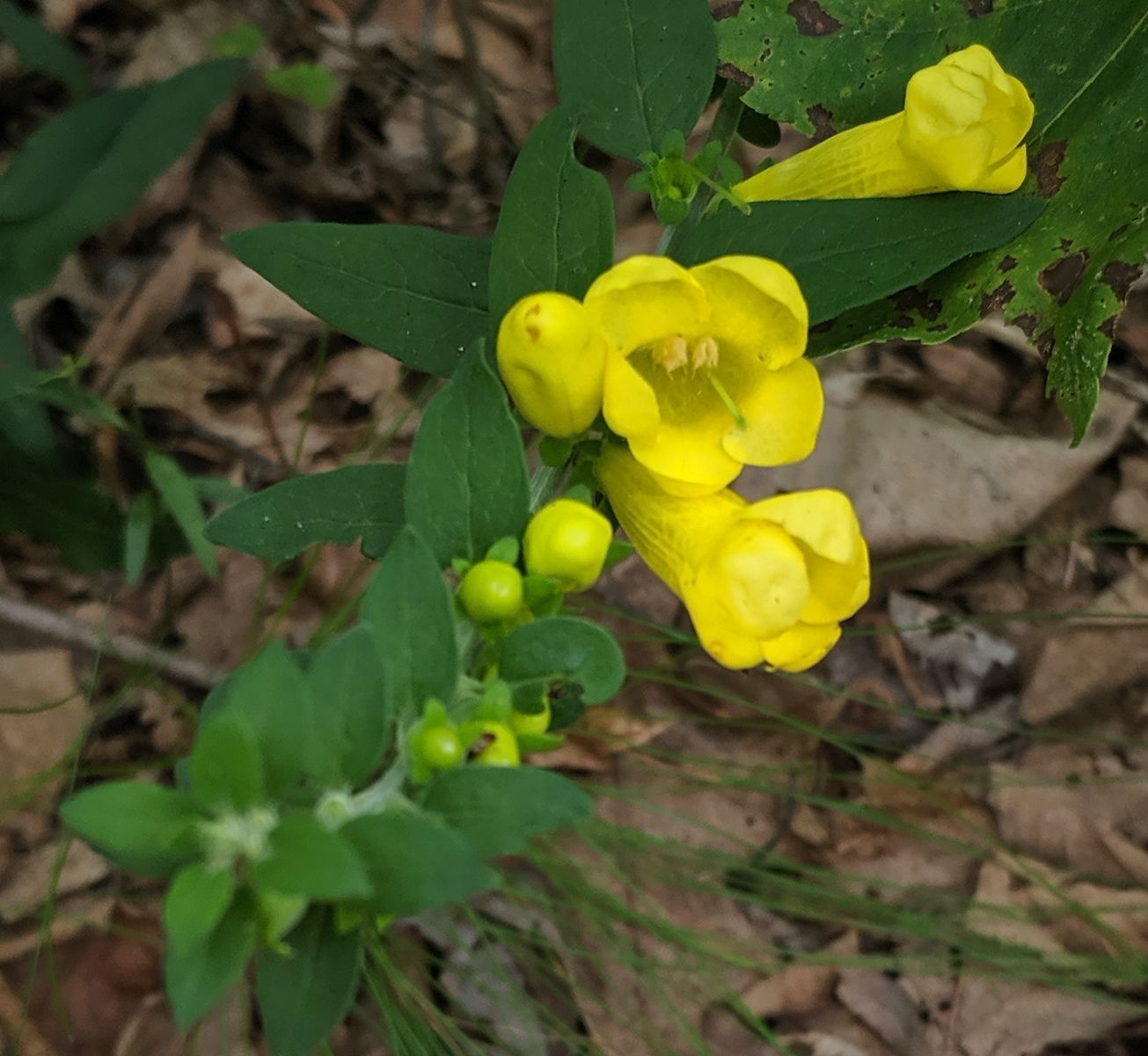 Entire-leaved False Foxglove (Aureolaria laevigata) flowers are eye-catching: leafy racemes of 1-2 inch yellow tubes with five, flaring lobes at the end. It has a smooth, green stem and most leaves are entire, though lower leaves may be toothed.