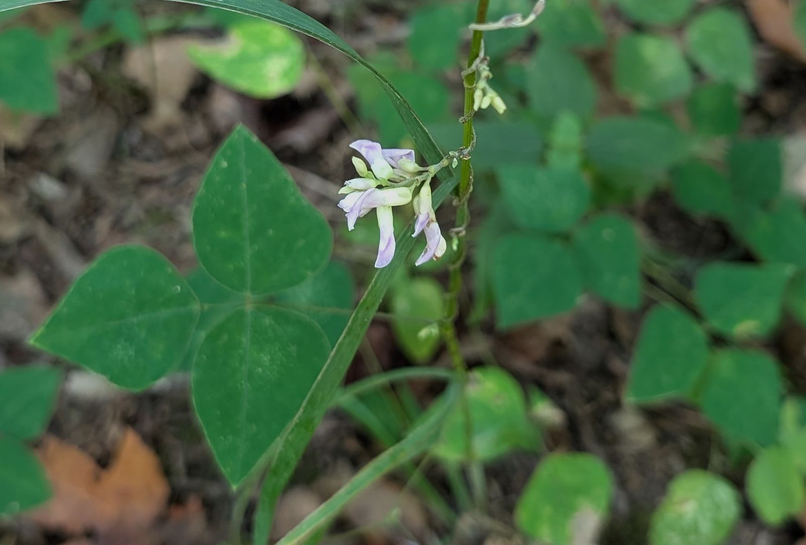 Hog-Peanut (Amphiocarpaea bracteata) is a twining vine. It stays low and often just lays across other plants rather than wrapping around them. The leaves alternate along the stem and have three leaflets. The leaflets can be almost three inches. They have a round base from which each side extends straight for two-thirds of the leaflet to a point. They have been teasing us all summer and only put out flowers at the last moment before cooler weather. The half-inch purple-pink flowers are arranged in a raceme. They hardly seem to open, the banner petal peeling back from the other four petals, and the wing petals barely unwrapping from the two petals that are fused into a keel.