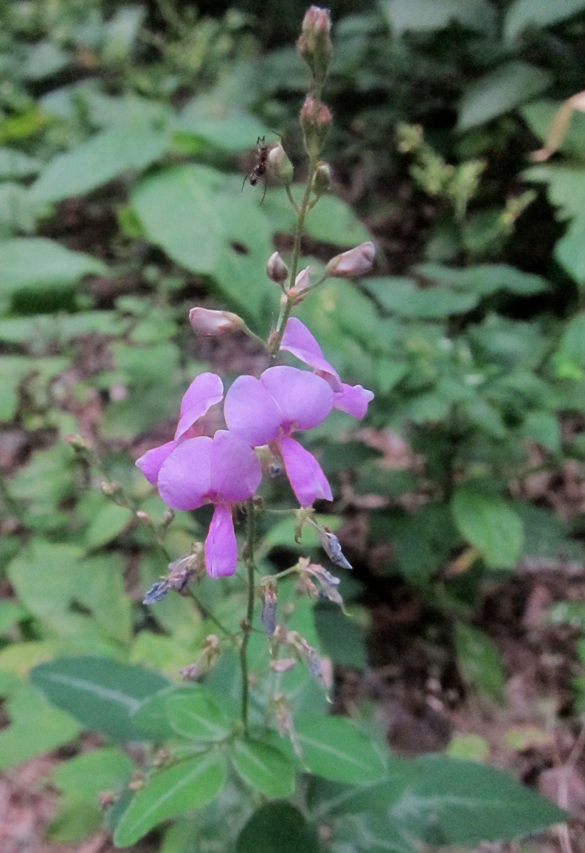 Naked-Flowered Tick-trefoil (Hylodesmum nudiflorum) flower stems have no leaves. The stem may reach over three feet, often leaning into the trail, with a panicle of flowers at the end which later become pods, ready to grab you. The stem comes straight out of the ground. The leaves arise from ground completely divorced from the flower stem above ground.
